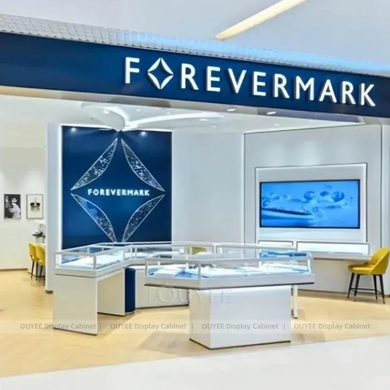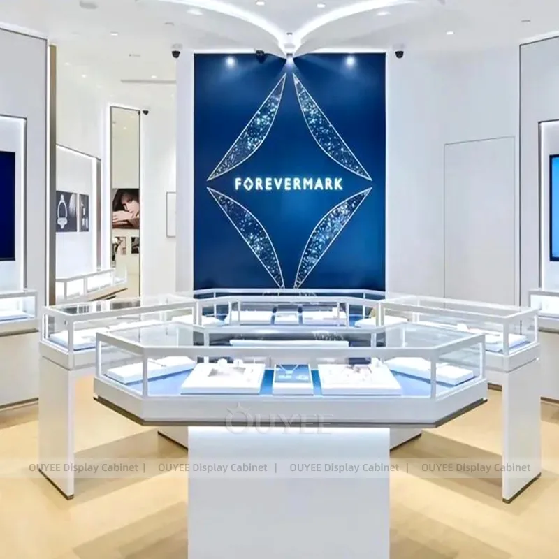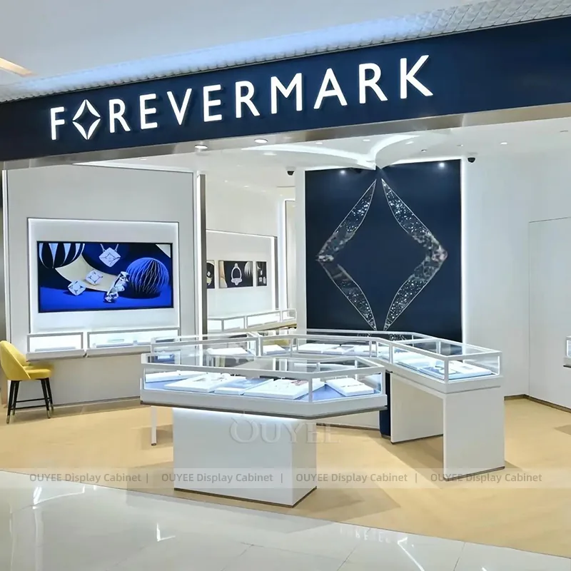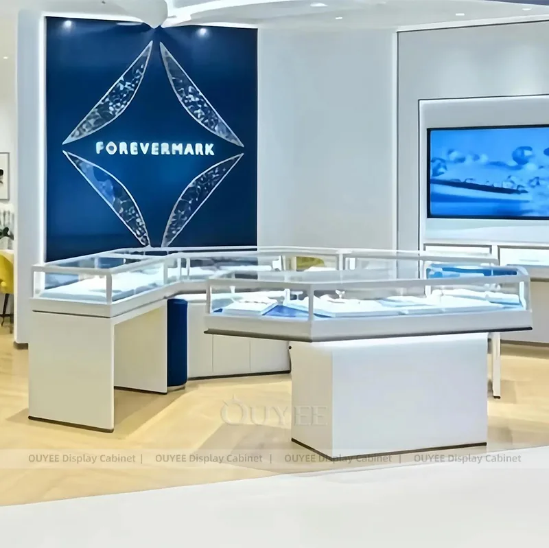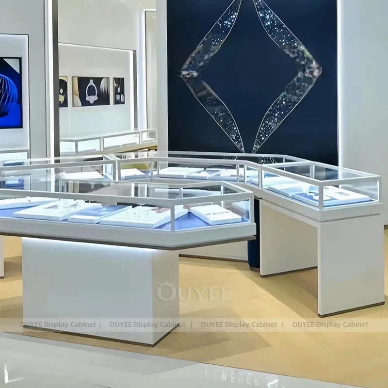 OUYEE can produce this model with tempered glass, lacquered display panels, and custom jewelry fixture joinery. We can adjust dimensions, counter heights, storage details, showcase proportions, branding areas, and clean white finishes so the project fits the store concept, SKU mix, and floor plan. Related inspiration is available across jewelry shop displays, display cases and our store fixture manufacturing service.