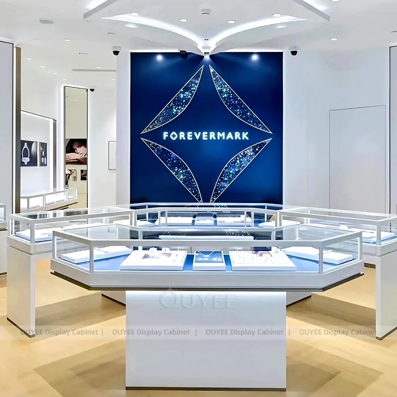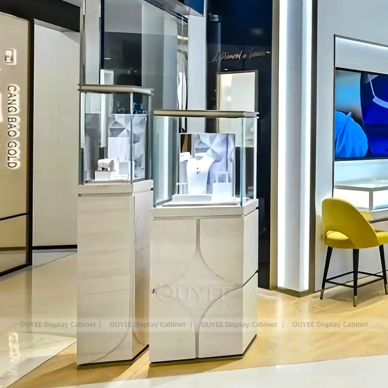 OUYEE develops Custom White Jewelry Display Showcases for fine jewelry boutiques, luxury mall stores, watch retailers, and premium accessories showrooms. This custom jewelry showcase concept helps luxury retailers present rings, necklaces, watches, and high-value accessories with a calmer visual rhythm and more premium customer perception.