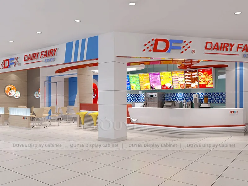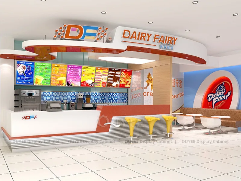 OUYEE can customize this model with durable counter and storage modules. Store owners can adjust size, finish, layout, logo panel, counter height, storage structure, service opening, pickup area, cup storage, equipment clearance, dessert display depth, front presentation area, menu areas, cup storage, topping display, lighting position, counter depth, and brand logo details to match the final shop drawing.