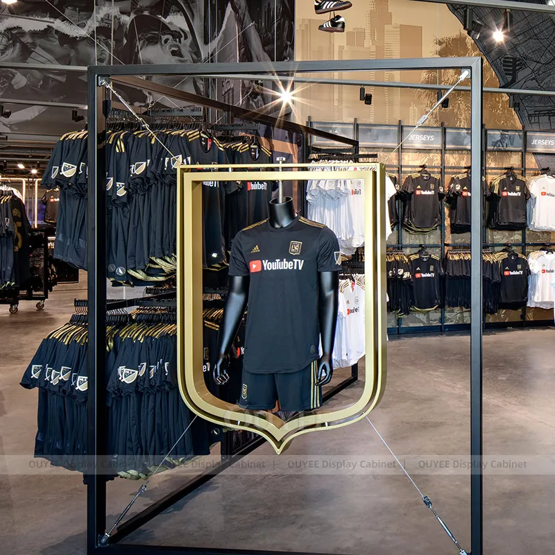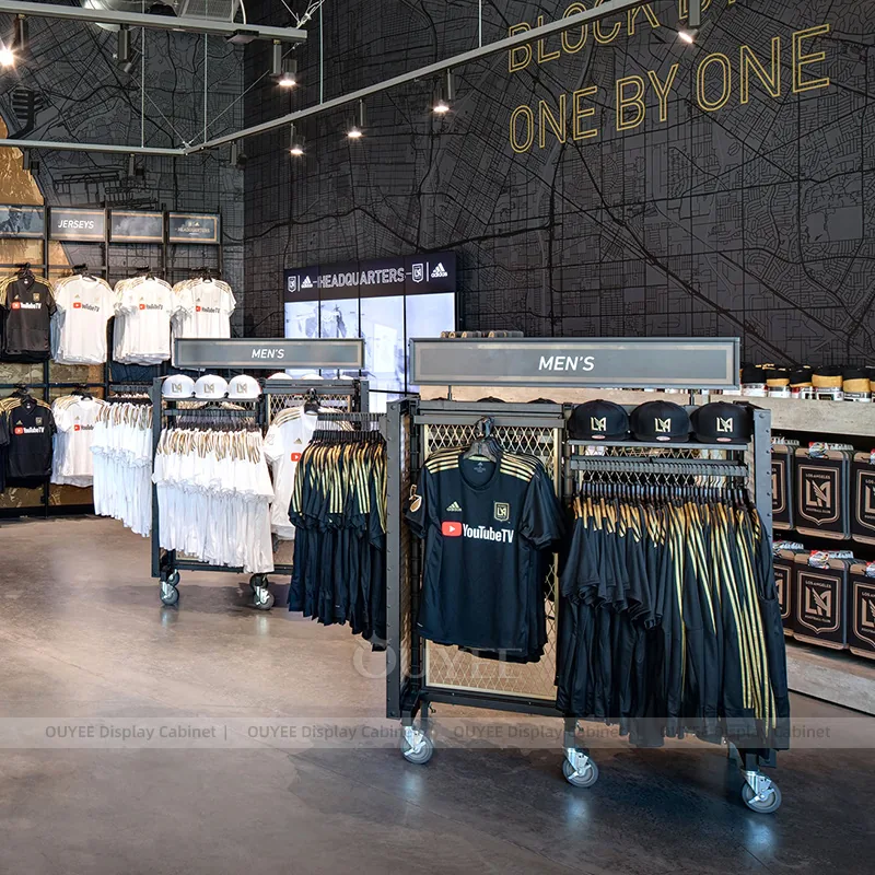 This configuration works well for stadium team stores, university fan shops, sports merchandise retailers, and branded event retail. It is suitable for stores that want custom display hardware, more coherent fixture language, and a practical combination of feature presentation, everyday stock holding, and shopper-friendly access.