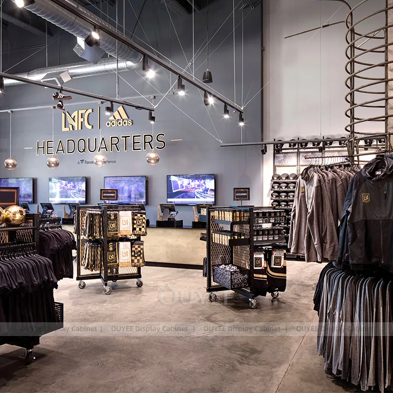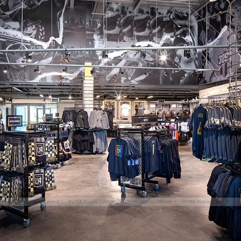 OUYEE can produce this model with powder-coated metal framing. Depending on the project, we can adjust dimensions, storage capacity, shelf depths, hanging components, branding graphics, and finish details so the system fits the real floor plan and product mix. Related inspiration is available across clothing racks, retail store display and our store fixture manufacturing service.