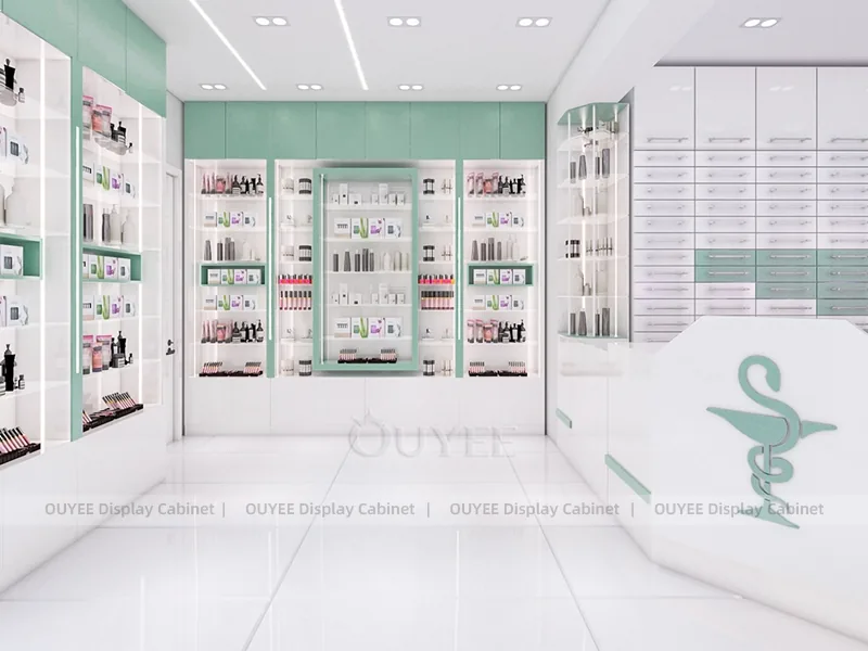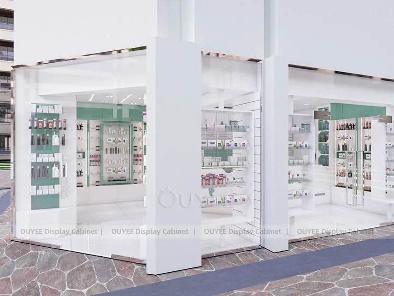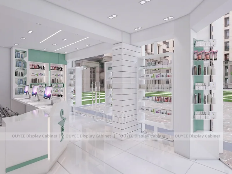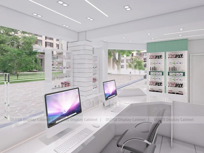 This configuration works well for skincare clinics, cosmetic consultation stores, dermatology retail spaces, and beauty service counters. It is suitable for cosmetic store openings, beauty shop renovations, department-store counter upgrades, pop-up retail projects, and custom display fixture programs that need consistent production quality.