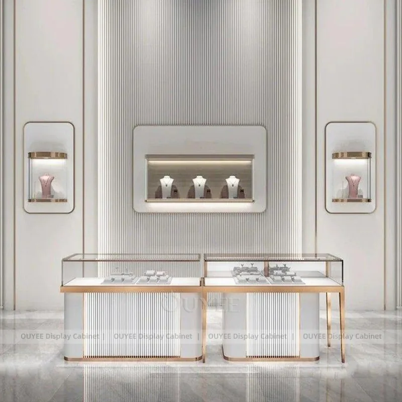 OUYEE can produce this model with tempered glass, lacquered display panels, and custom jewelry fixture joinery. We can adjust dimensions, counter heights, storage details, showcase proportions, branding areas, and warm beige finishes so the project fits the store concept, SKU mix, and floor plan. Related inspiration is available across jewelry shop displays, display cabinet and our store fixture manufacturing service.