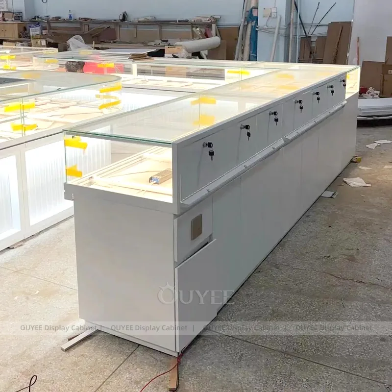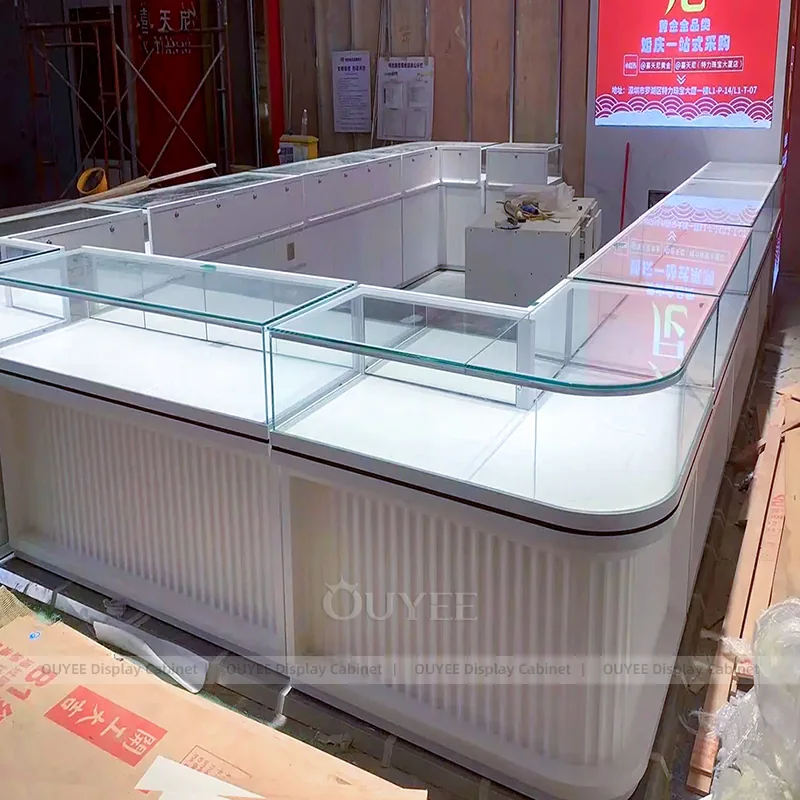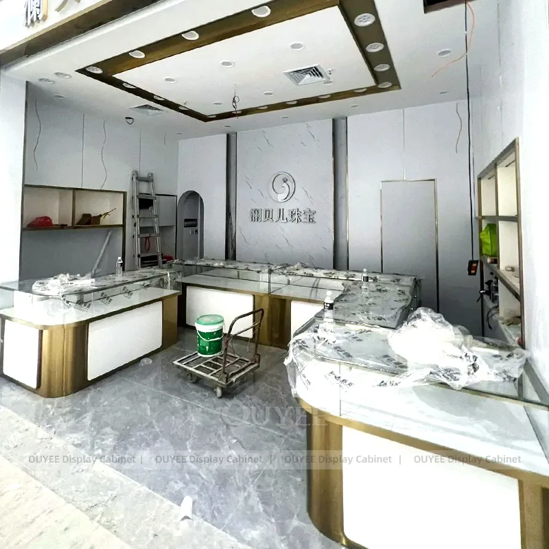 OUYEE can produce this model with tempered glass, lacquered display panels, and custom jewelry fixture joinery. We can adjust dimensions, counter heights, storage details, showcase proportions, branding areas, and deep black finishes so the project fits the store concept, SKU mix, and floor plan. Related inspiration is available across jewelry shop displays, display cabinet and our store fixture manufacturing service.
