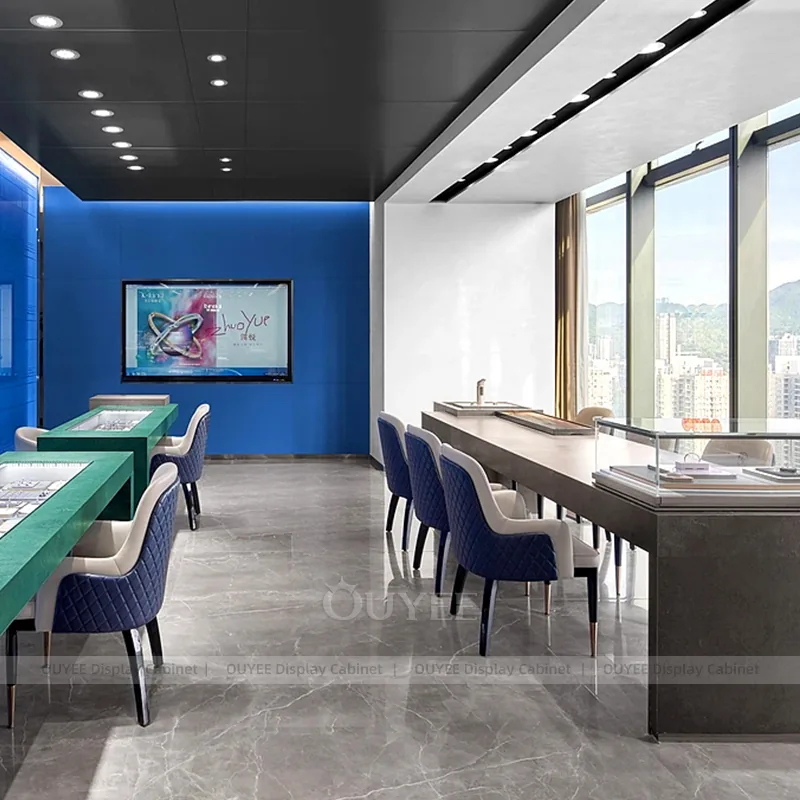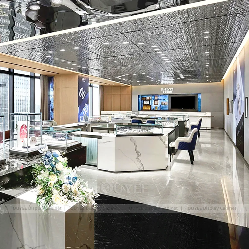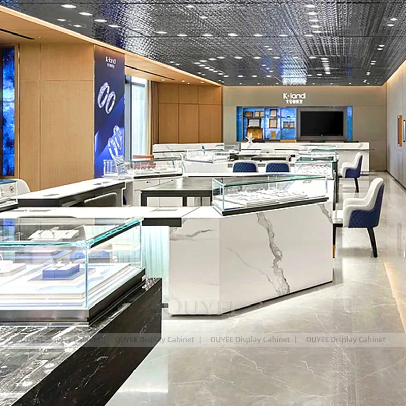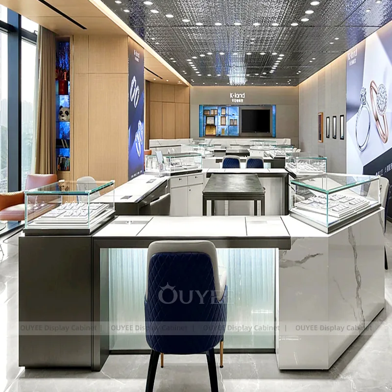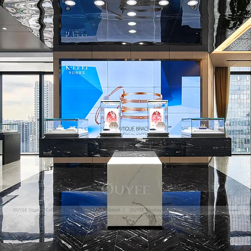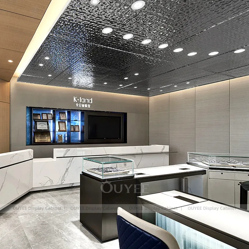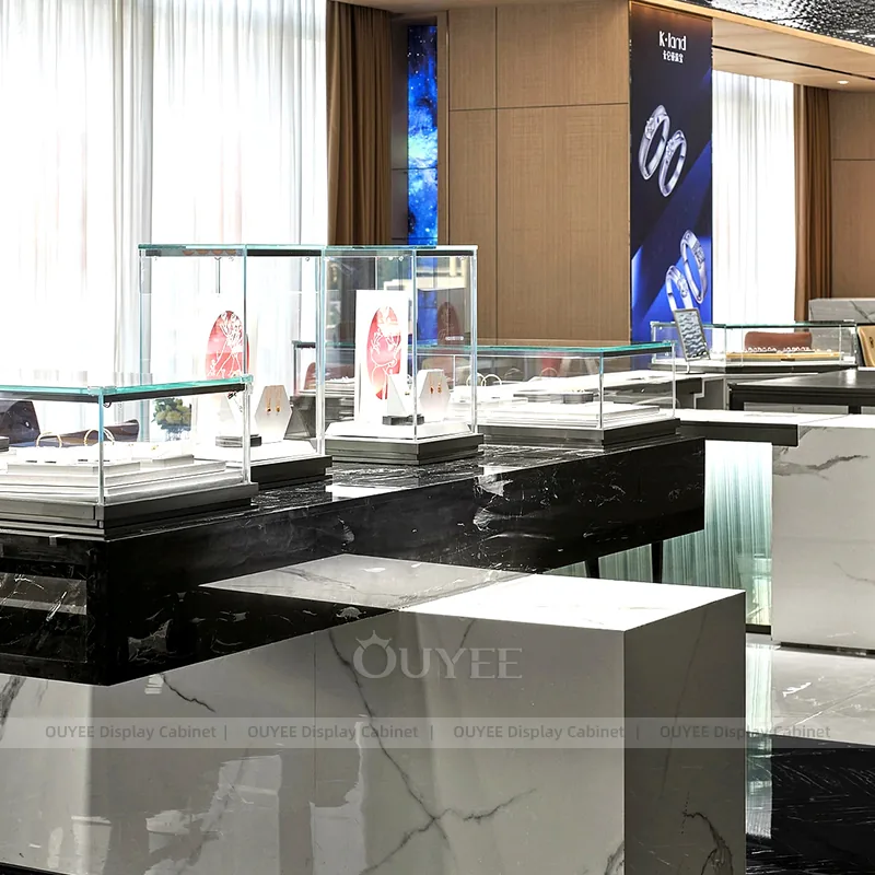 OUYEE can produce this model with tempered glass, fluted wood cladding, and custom jewelry fixture joinery. We can adjust dimensions, counter heights, storage details, showcase proportions, branding areas, and fluted wood textures so the project fits the store concept, SKU mix, and floor plan. Related inspiration is available across jewelry shop displays, display cabinet and our store fixture manufacturing service.
