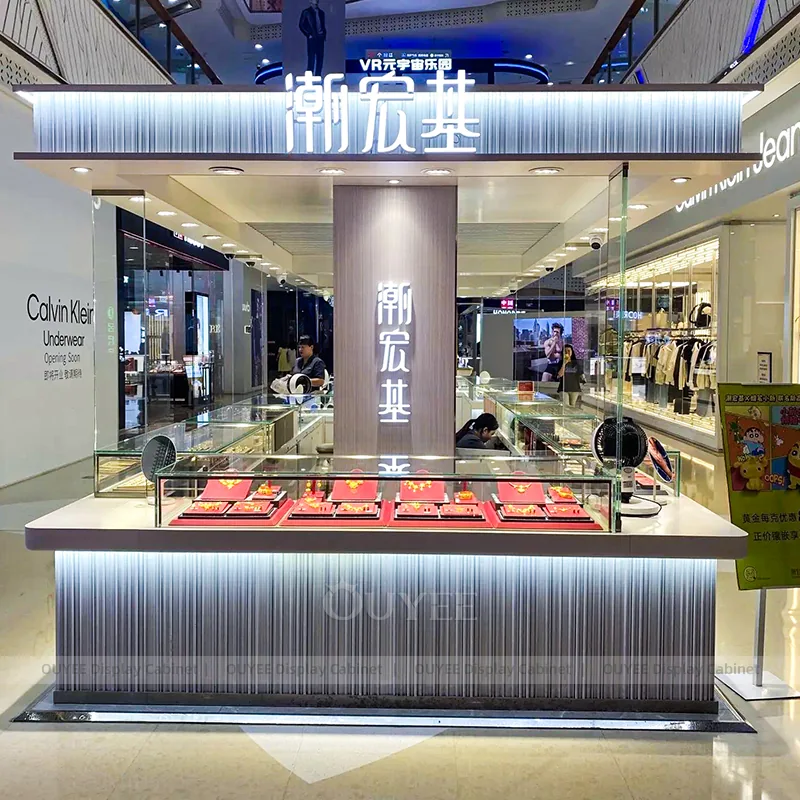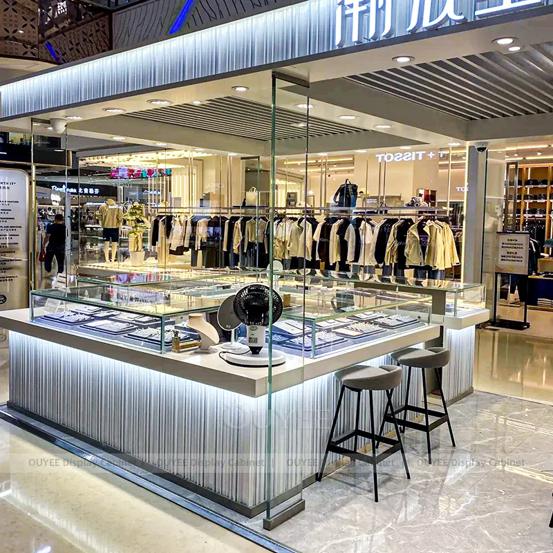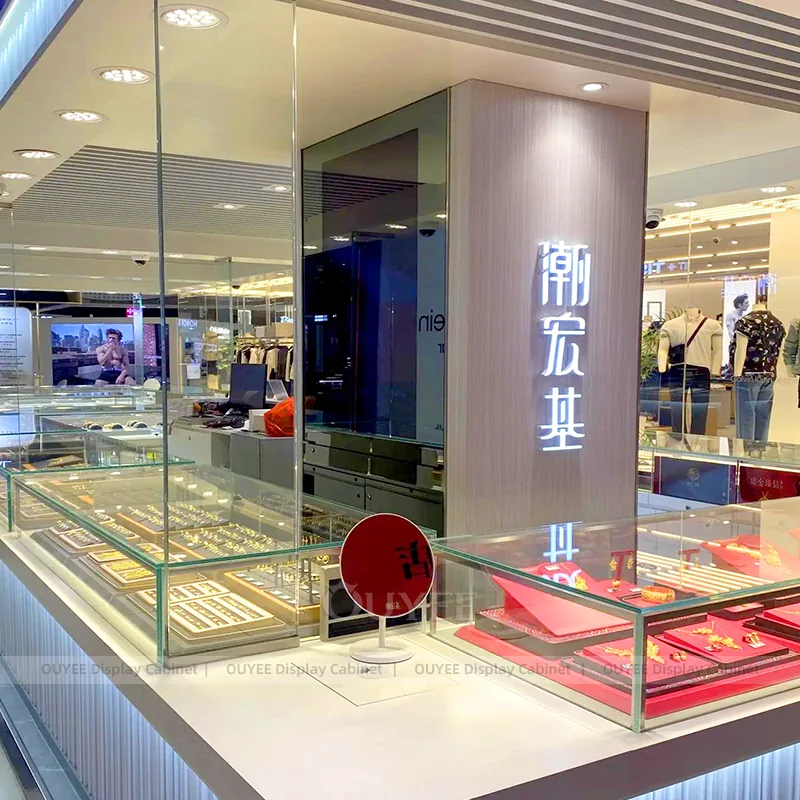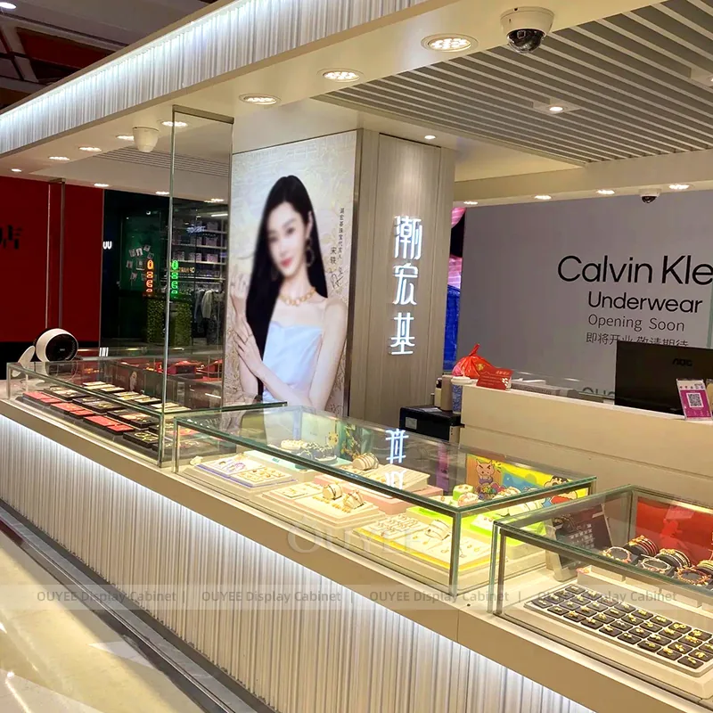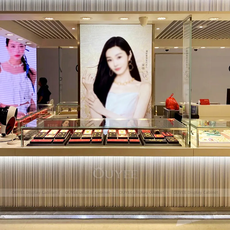 OUYEE can produce this model with tempered glass, fluted wood cladding, and custom jewelry fixture joinery. We can adjust dimensions, counter heights, storage details, showcase proportions, branding areas, and fluted wood textures so the project fits the store concept, SKU mix, and floor plan. Related inspiration is available across jewelry shop displays, display cabinet and our store fixture manufacturing service.