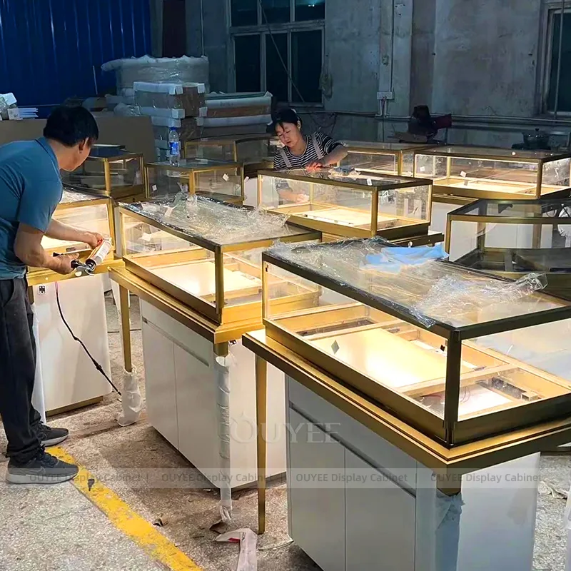 OUYEE can produce this model with tempered glass, walnut veneer cabinetry, and custom jewelry fixture joinery. We can adjust dimensions, counter heights, storage details, showcase proportions, branding areas, and walnut wood tones so the project fits the store concept, SKU mix, and floor plan. Related inspiration is available across jewelry shop displays, display cabinet and our store fixture manufacturing service.