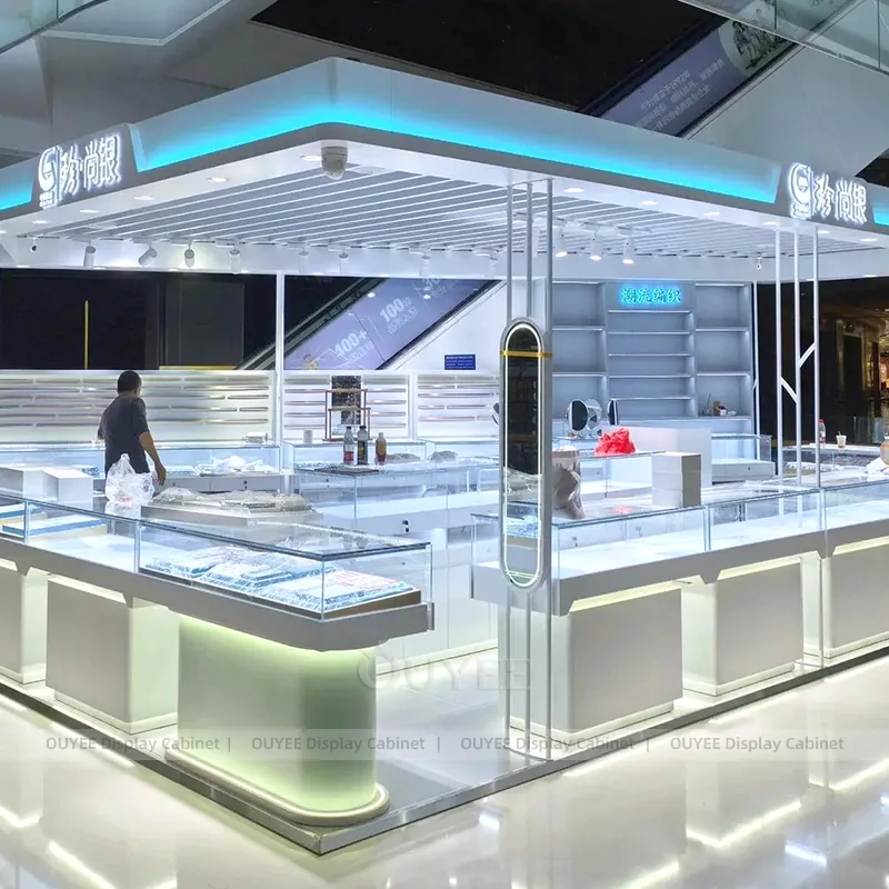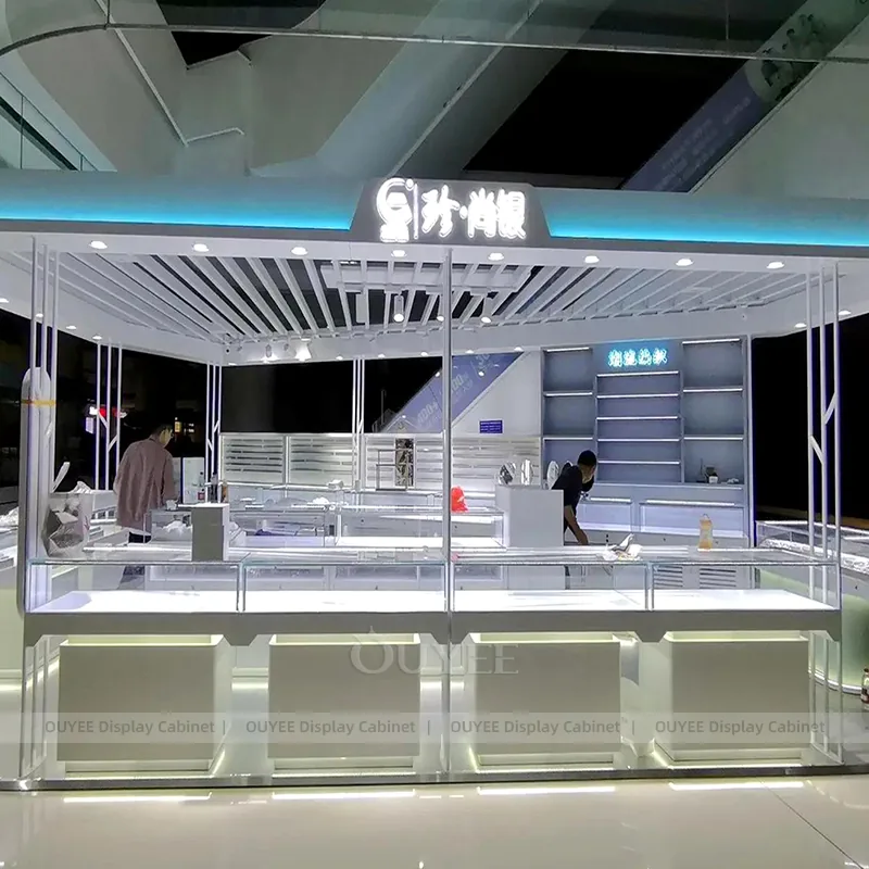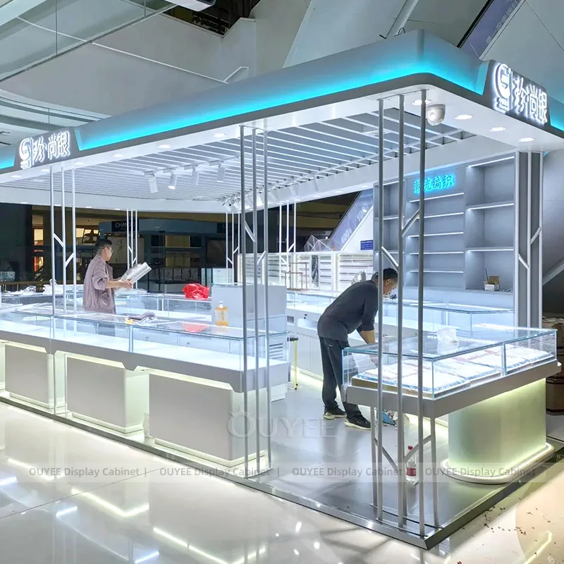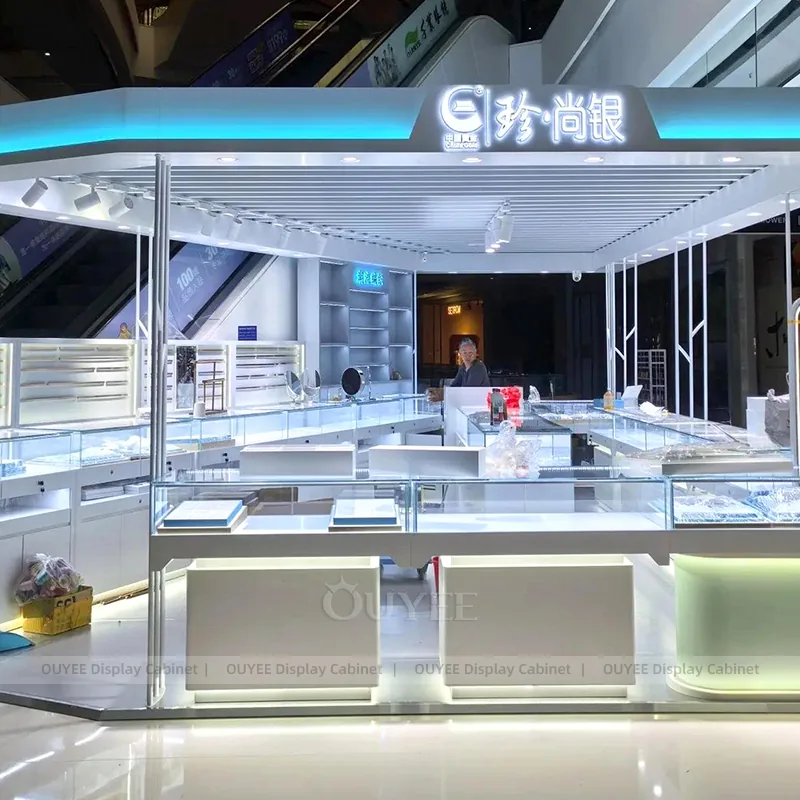 OUYEE can produce this model with tempered glass, walnut veneer cabinetry, and custom jewelry fixture joinery. We can adjust dimensions, counter heights, storage details, showcase proportions, branding areas, and walnut wood tones so the project fits the store concept, SKU mix, and floor plan. Related inspiration is available across jewelry shop displays, display cabinet and our store fixture manufacturing service.