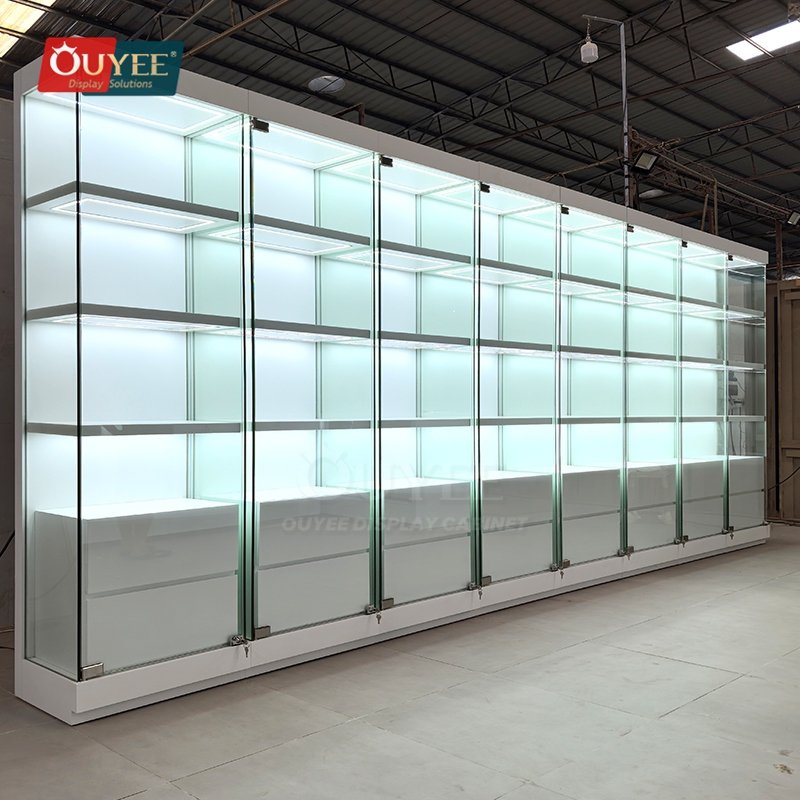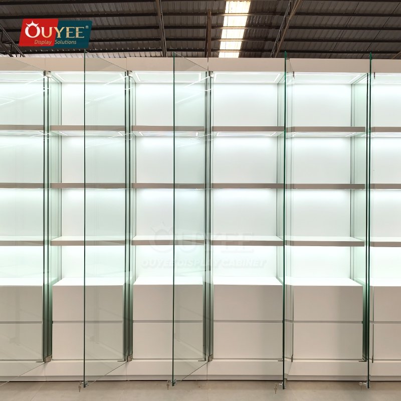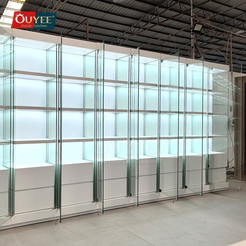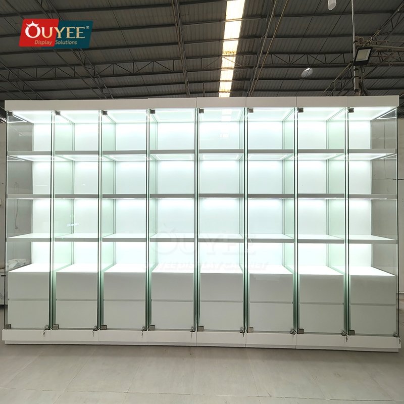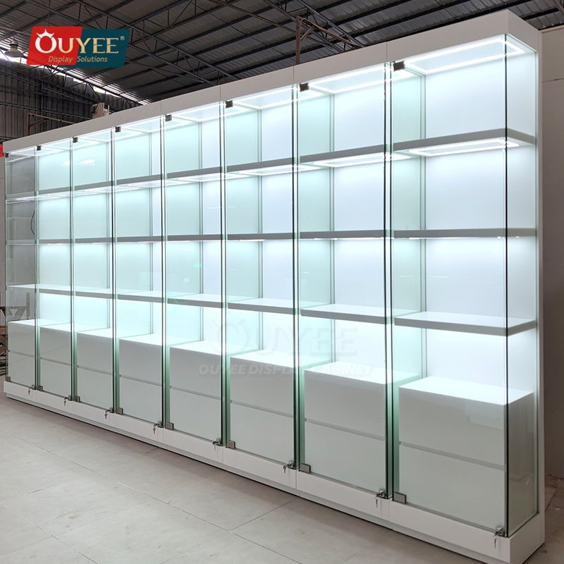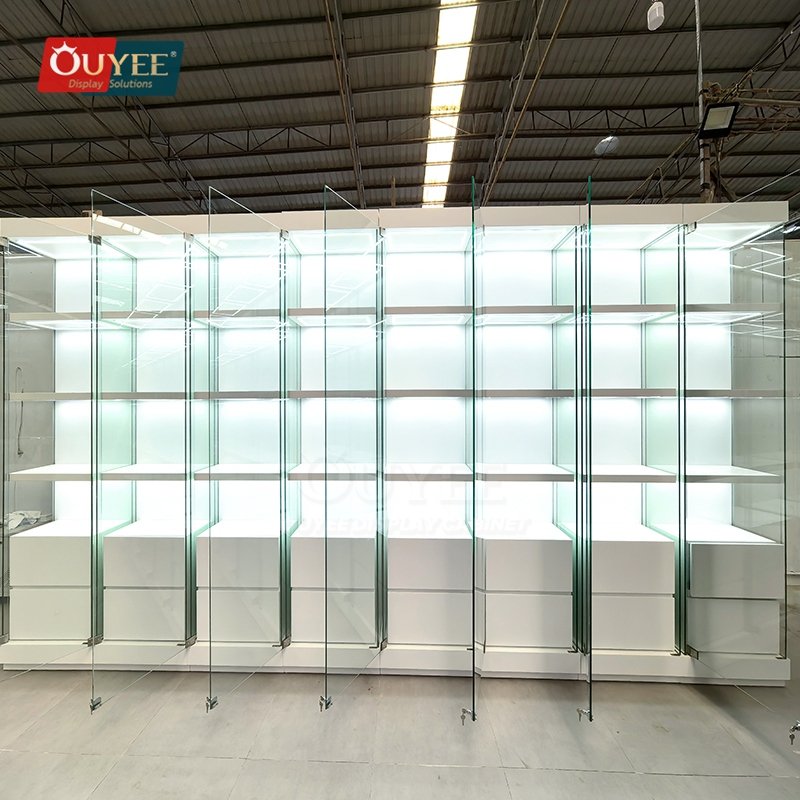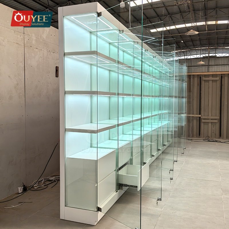 Built with tempered glass, and practical storage drawers, this custom display solution is made for long-term commercial use. OUYEE can adjust cabinet dimensions, shelf positions, lighting temperature, finish tones, storage modules, and logo details to match different retail concepts. If your project also needs related showcase ideas, you can browse our glass display cabinet and display cases pages for more references.