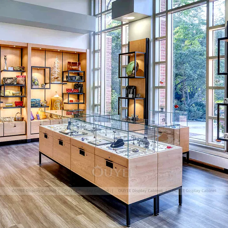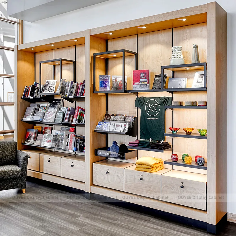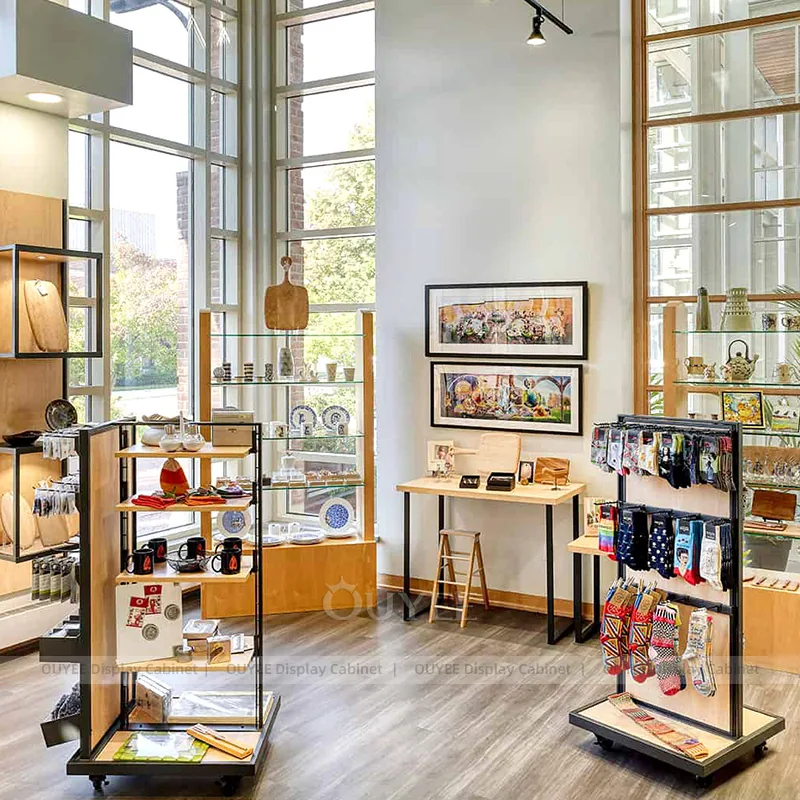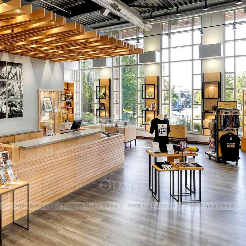 OUYEE develops Gift Shop Cash Wrap with Tall Display Shelving for museum stores, travel gift shops, themed retail boutiques, and souvenir-focused commercial interiors. This custom display rack package helps stores organize gift items, boxed products, souvenirs, and impulse-friendly merchandise while keeping the fixture language clear and project-ready for commercial rollout.