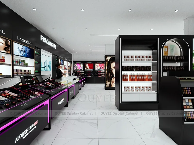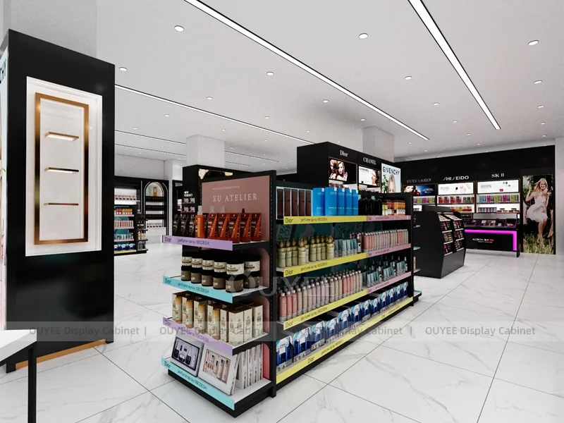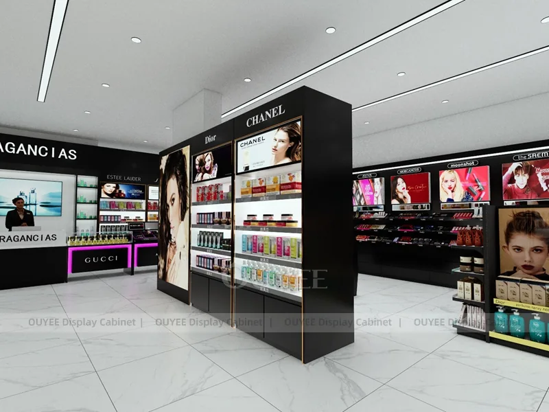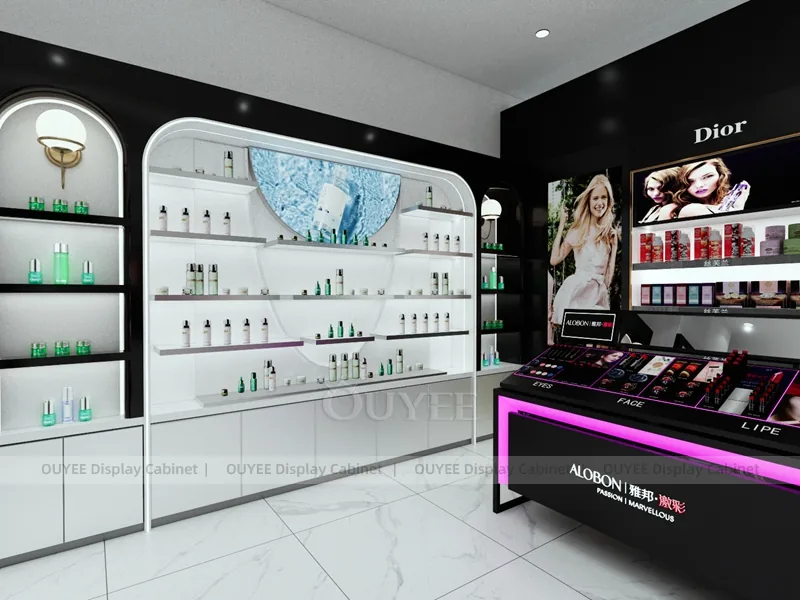 OUYEE can produce this model with tempered glass display sections, premium metal frames, LED lighting, and commercial-grade display panels. Dimensions, finish colors, shelf depths, light boxes, tester trays, logo panels, storage modules, and counter details can be adjusted to match the store plan and brand identity. Related inspiration is available across display shelves, wall display, display counter, and our store fixture manufacturing service.