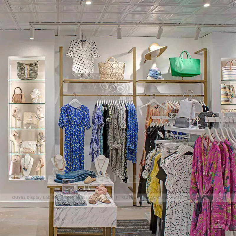 OUYEE can produce this model with wood-look display panels, powder-coated metal framing, and modular wall merchandising panels. Depending on the project, we can adjust dimensions, storage capacity, shelf depths, hanging components, branding graphics, and finish details so the system fits the real floor plan and product mix. Related inspiration is available across clothing racks, wall display and our store fixture manufacturing service.