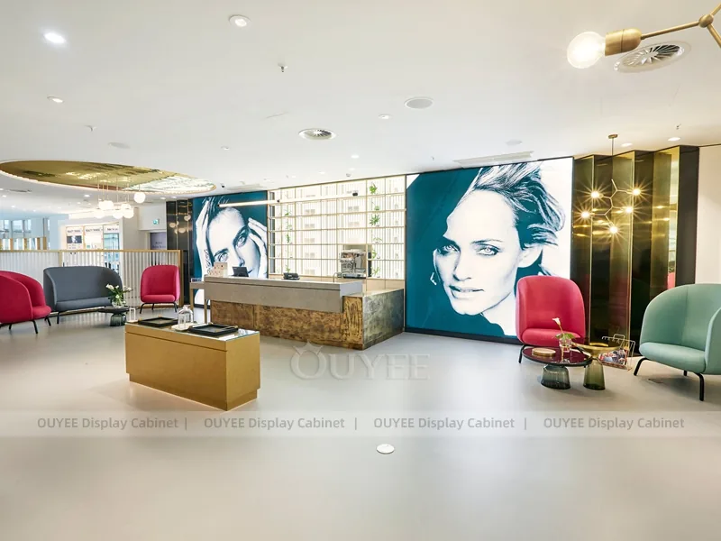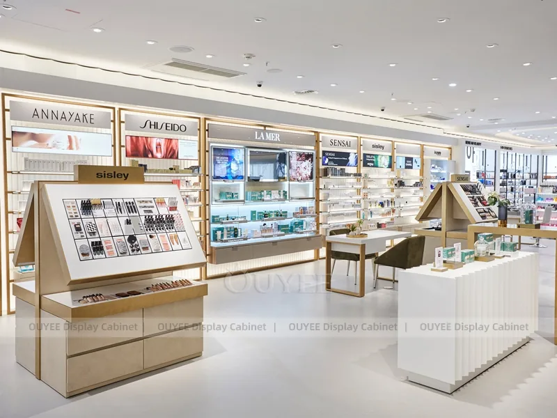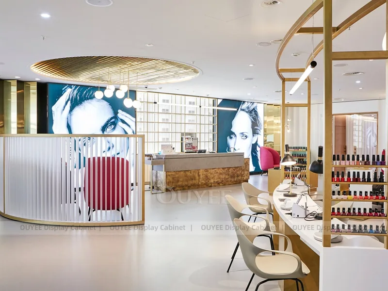 OUYEE develops the Gold Wave Counter Display for beauty retailers that need clearer product zoning, stronger brand presentation, and reliable fixture production for commercial store projects.