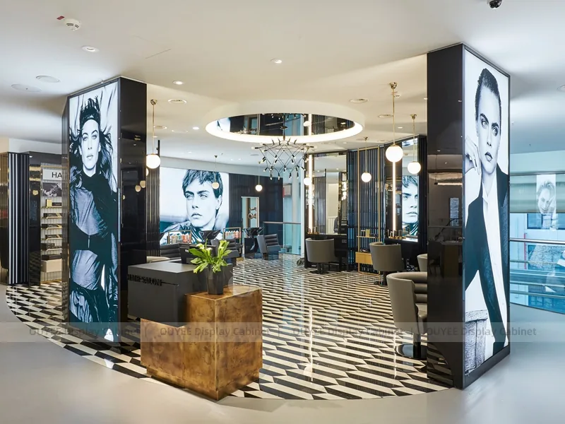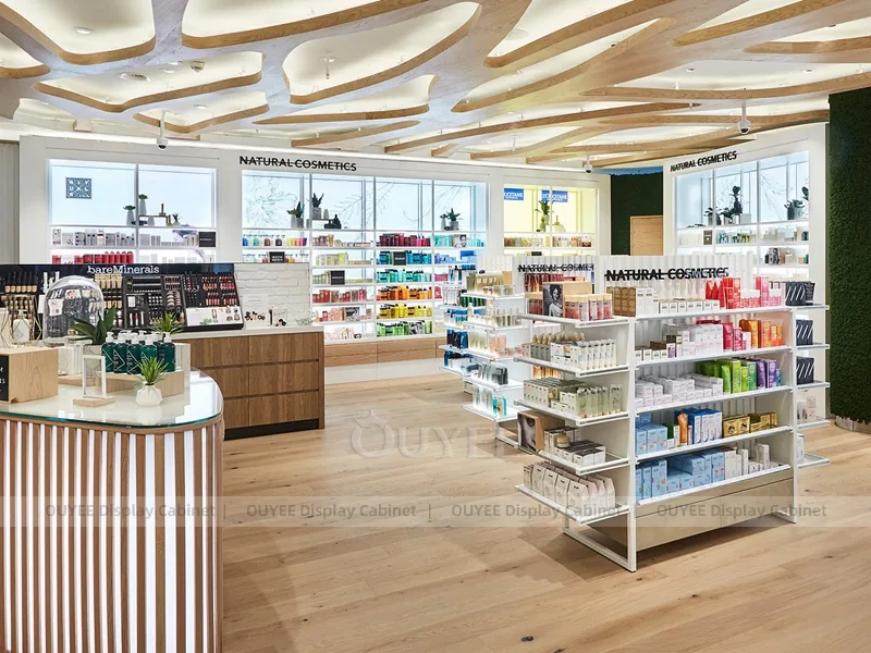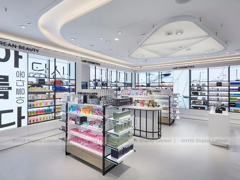 OUYEE can produce this model with premium laminate finishes, metallic trim details, tempered glass sections, and warm LED lighting. Dimensions, finish colors, shelf depths, light boxes, tester trays, logo panels, storage modules, and counter details can be adjusted to match the store plan and brand identity. Related inspiration is available across display shelves, wall display, display counter, and our store fixture manufacturing service.
