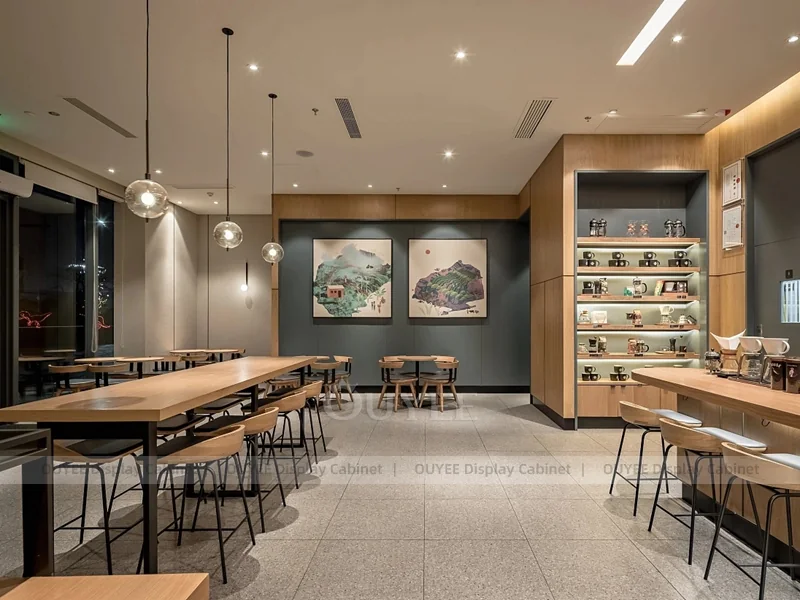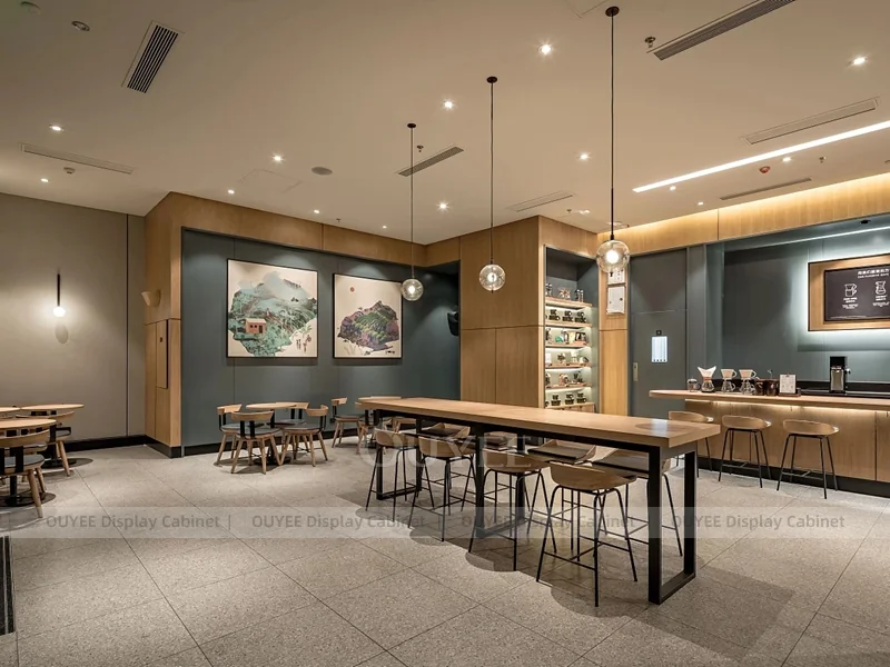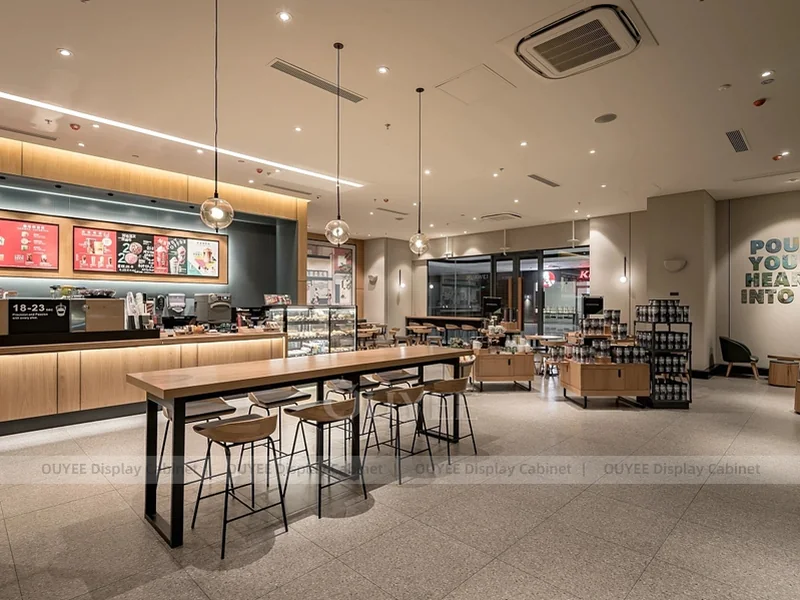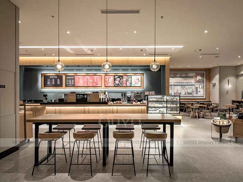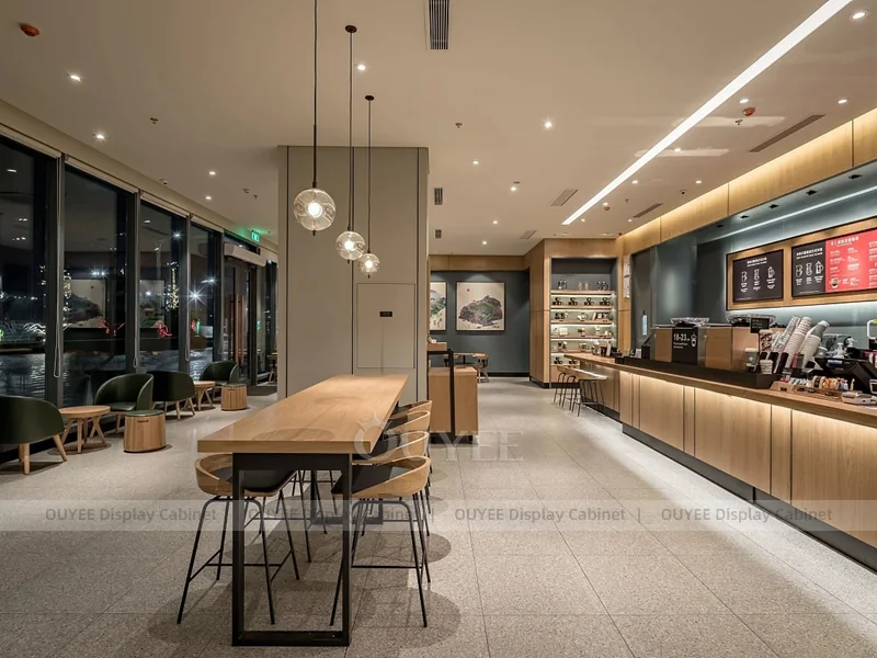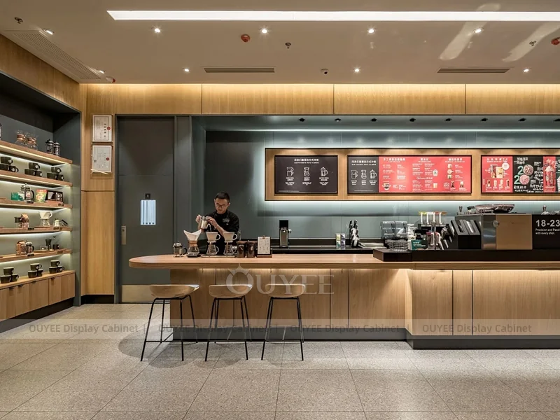 OUYEE supports coffee counter design, shop drawings, material selection, manufacturing, packing, and export delivery. We can customize the fixture according to your brand color, logo, store size, electrical planning, and installation requirements.