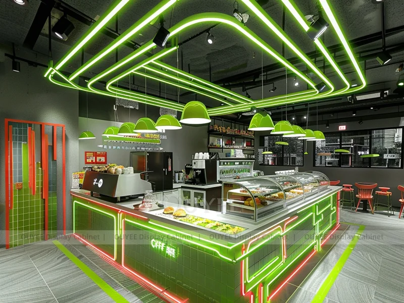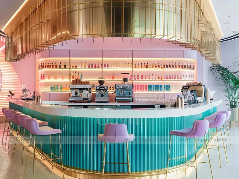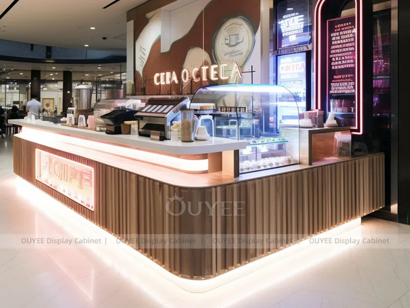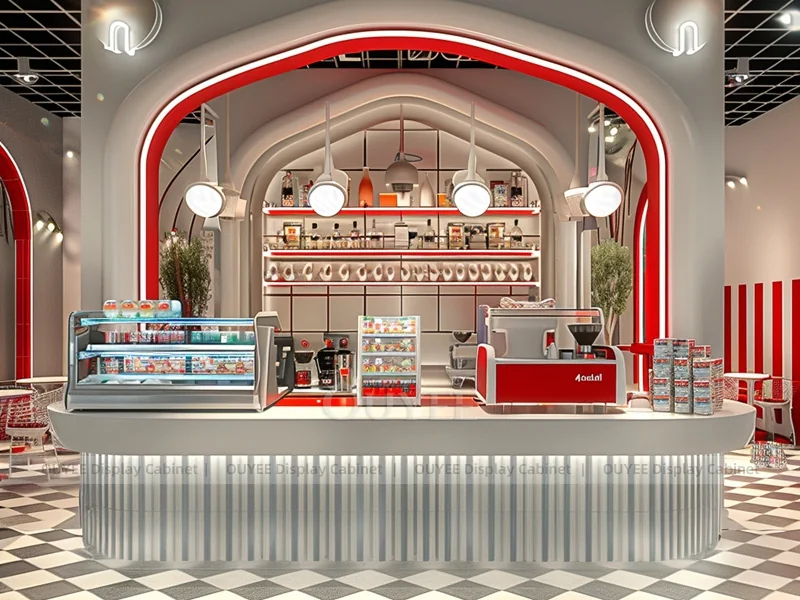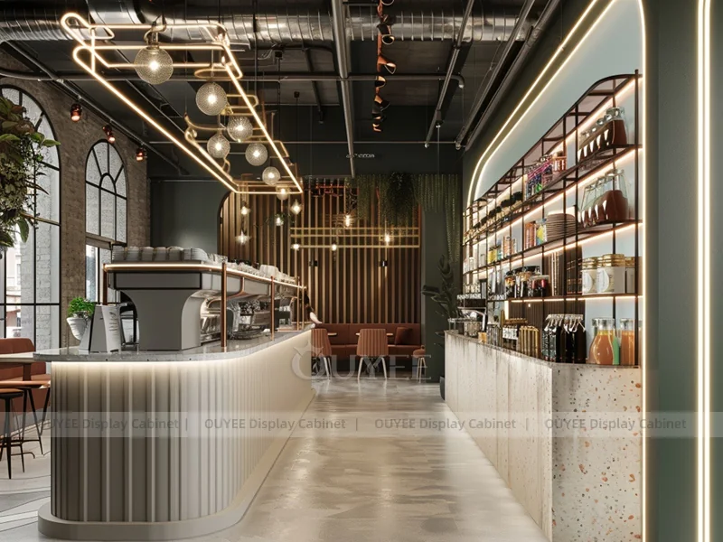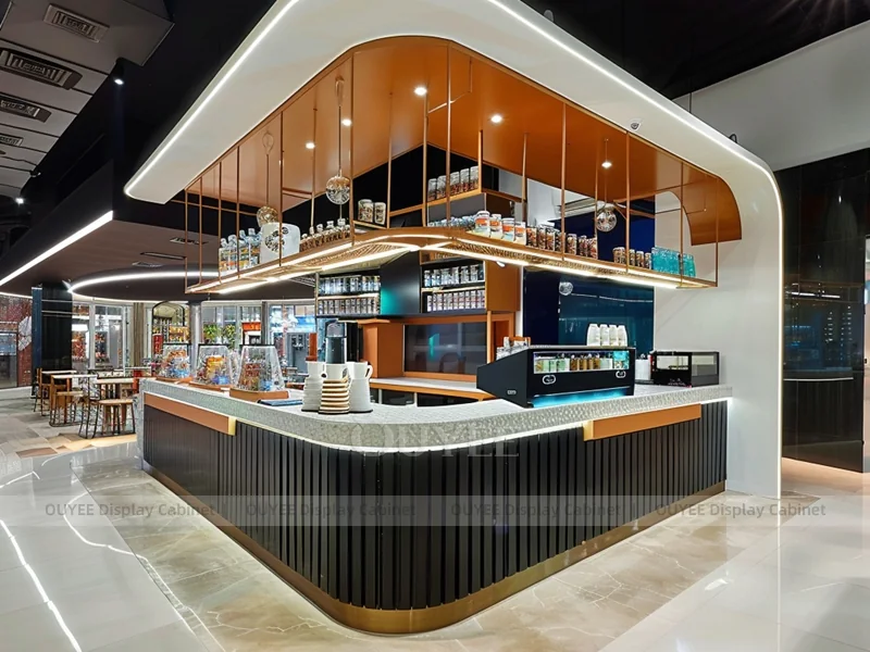 OUYEE supports coffee counter design, shop drawings, material selection, manufacturing, packing, and export delivery. We can customize the fixture according to your brand color, logo, store size, electrical planning, and installation requirements.