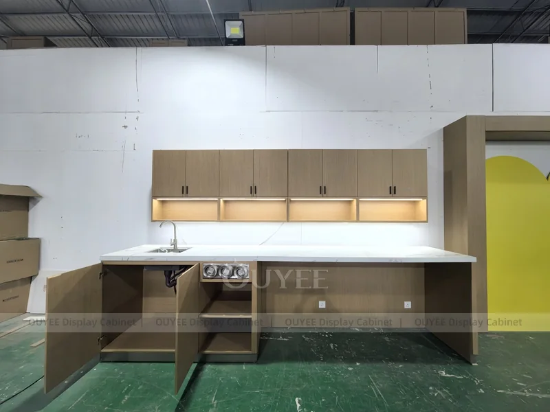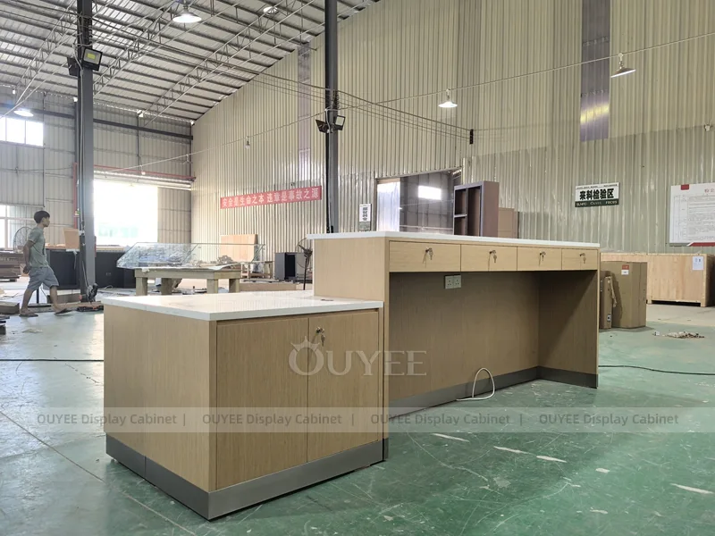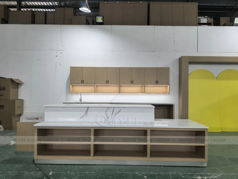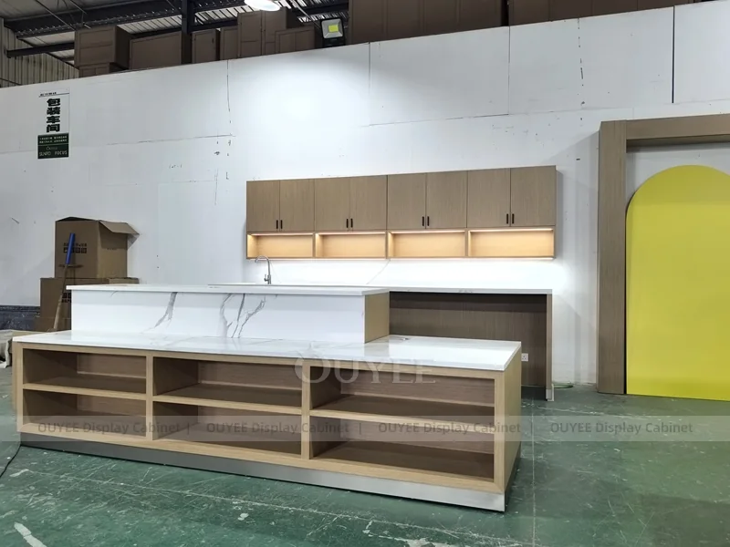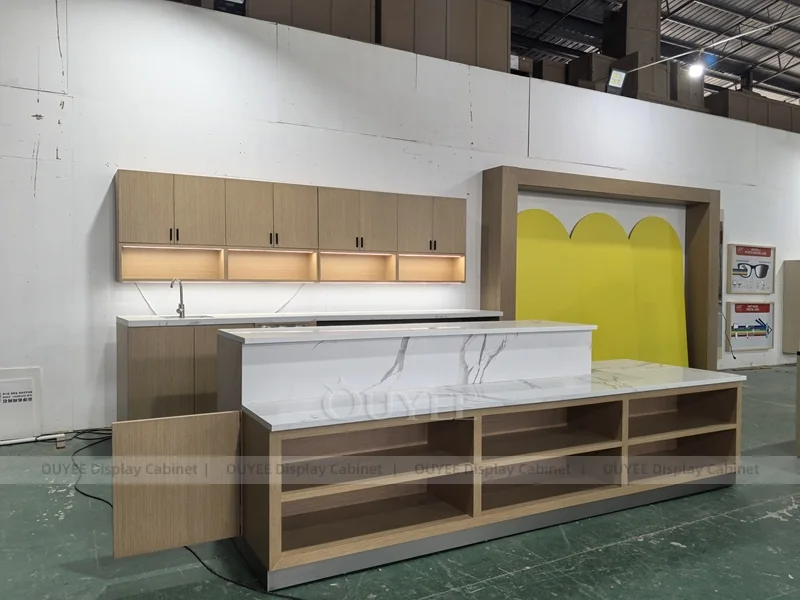 OUYEE supports coffee counter design, shop drawings, material selection, manufacturing, packing, and export delivery. We can customize the fixture according to your brand color, logo, store size, electrical planning, and installation requirements.