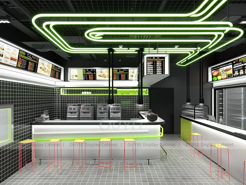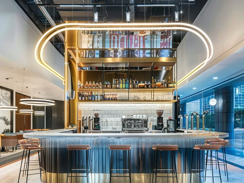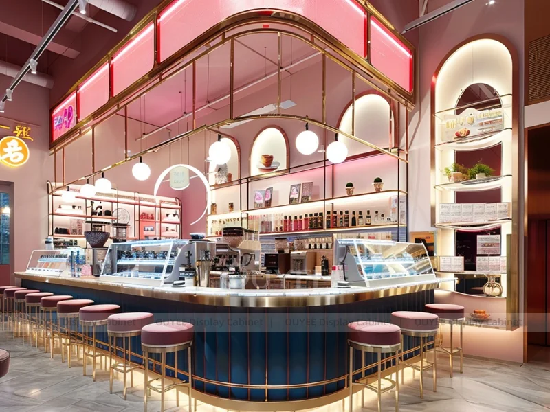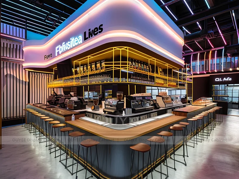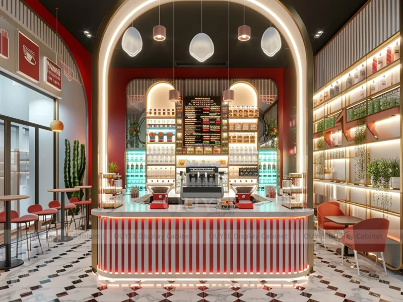 OUYEE supports coffee counter design, shop drawings, material selection, manufacturing, packing, and export delivery. We can customize the fixture according to your brand color, logo, store size, electrical planning, and installation requirements.