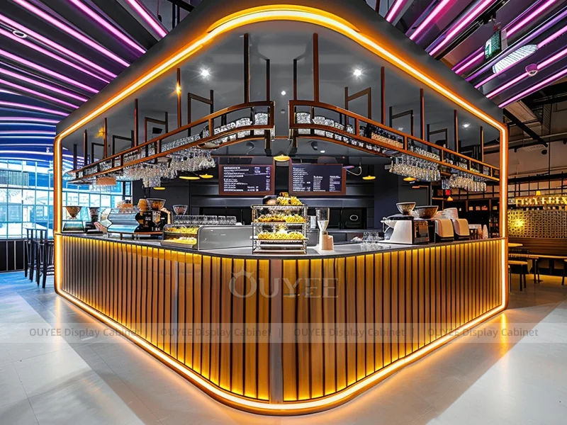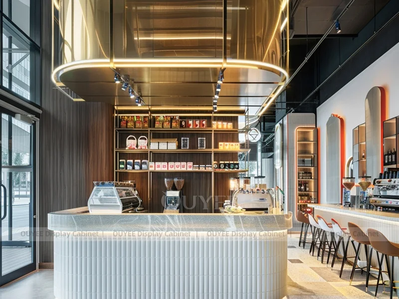 OUYEE supports coffee counter design, shop drawings, material selection, manufacturing, packing, and export delivery. We can customize the fixture according to your brand color, logo, store size, electrical planning, and installation requirements.