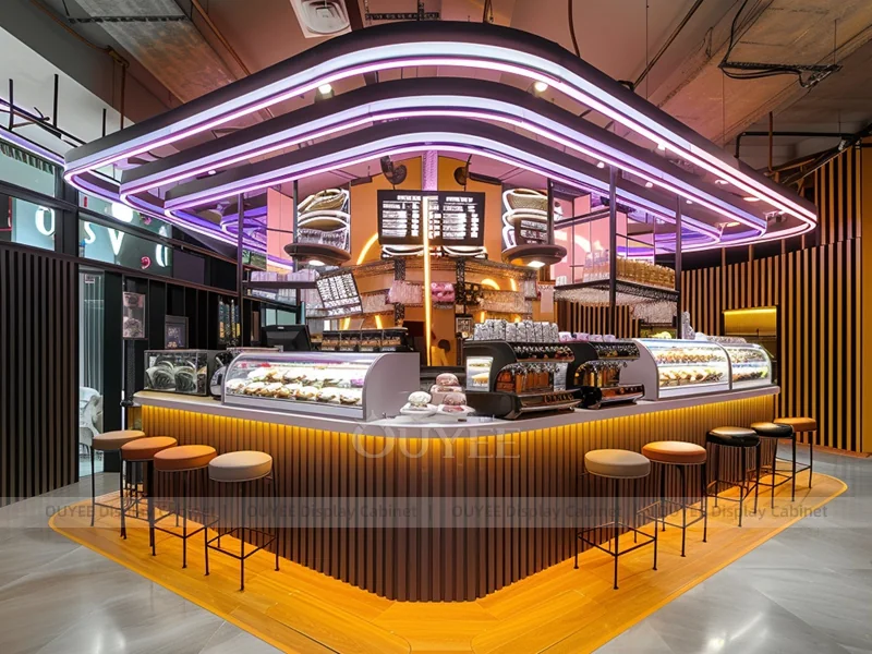OUYEE supports coffee counter design, shop drawings, material selection, manufacturing, packing, and export delivery. We can customize the fixture according to your brand color, logo, store size, electrical planning, and installation requirements.