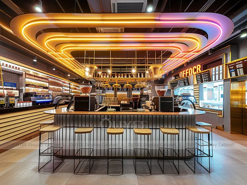 OUYEE supports coffee counter design, shop drawings, material selection, manufacturing, packing, and export delivery. We can customize the fixture according to your brand color, logo, store size, electrical planning, and installation requirements.