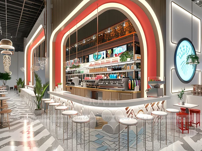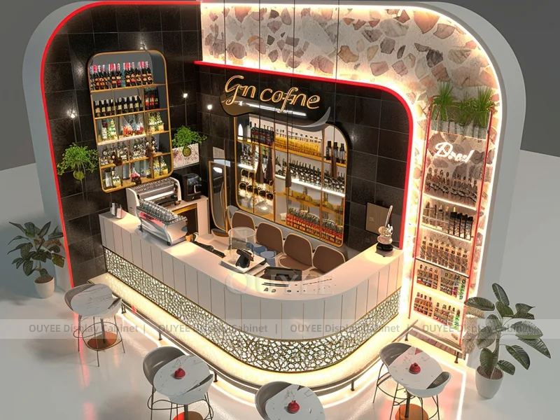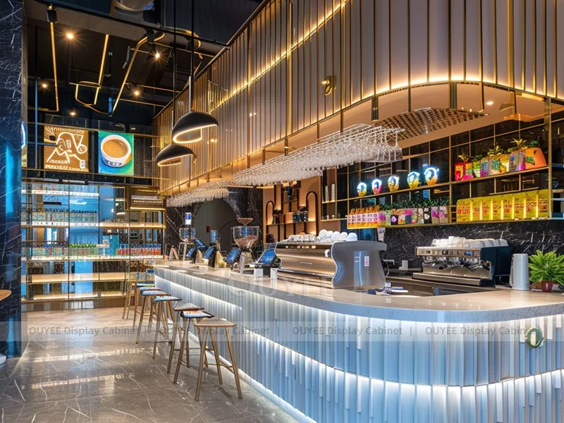 OUYEE supports coffee counter design, shop drawings, material selection, manufacturing, packing, and export delivery. We can customize the fixture according to your brand color, logo, store size, electrical planning, and installation requirements.