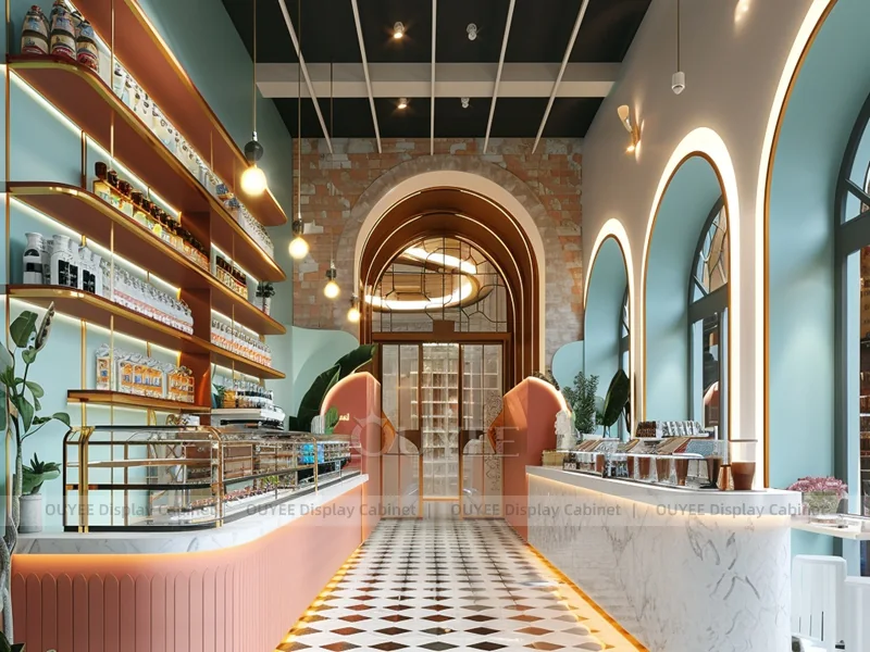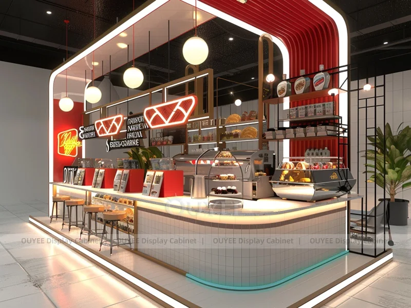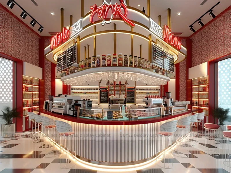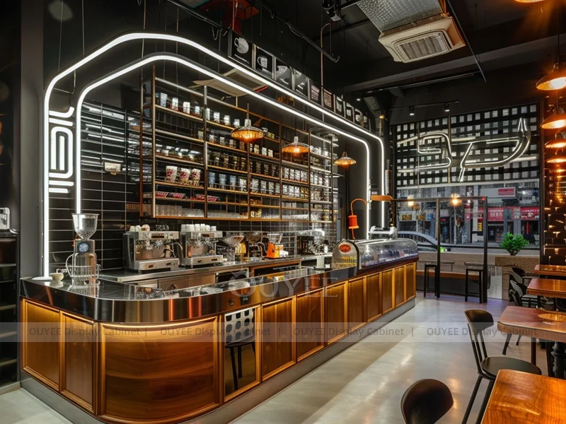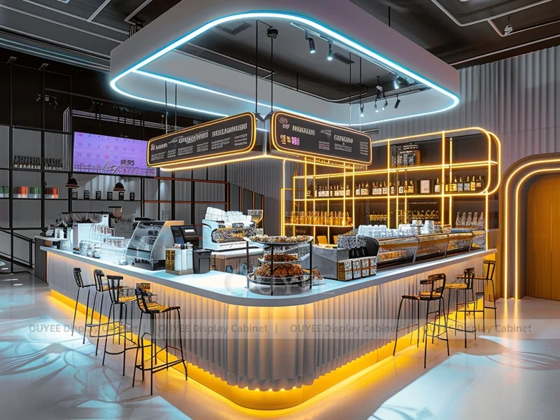 OUYEE supports coffee counter design, shop drawings, material selection, manufacturing, packing, and export delivery. We can customize the fixture according to your brand color, logo, store size, electrical planning, and installation requirements.
