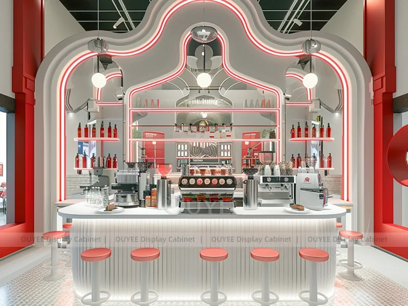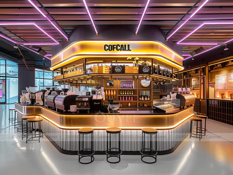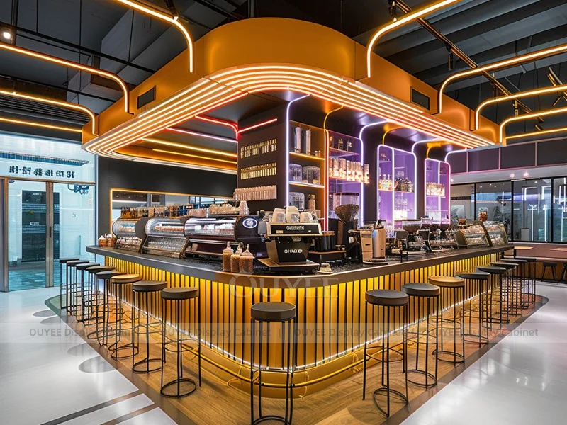 OUYEE supports coffee counter design, shop drawings, material selection, manufacturing, packing, and export delivery. We can customize the fixture according to your brand color, logo, store size, electrical planning, and installation requirements.