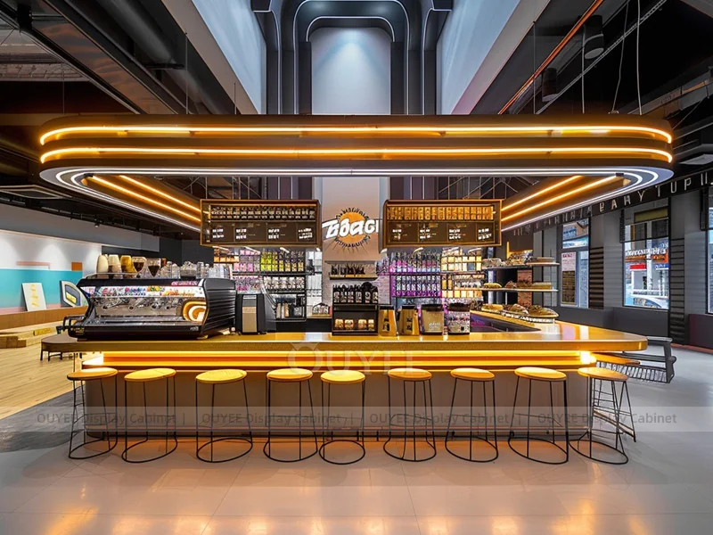 OUYEE supports coffee counter design, shop drawings, material selection, manufacturing, packing, and export delivery. We can customize the fixture according to your brand color, logo, store size, electrical planning, and installation requirements.