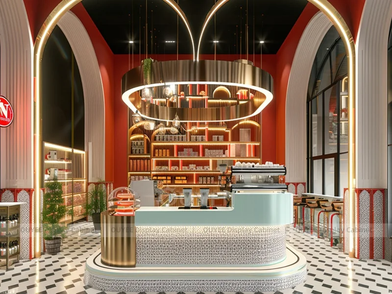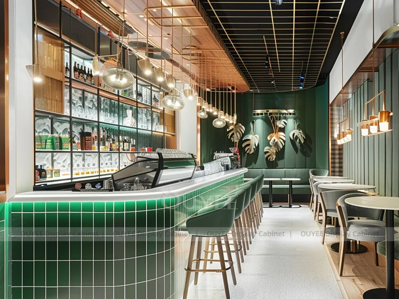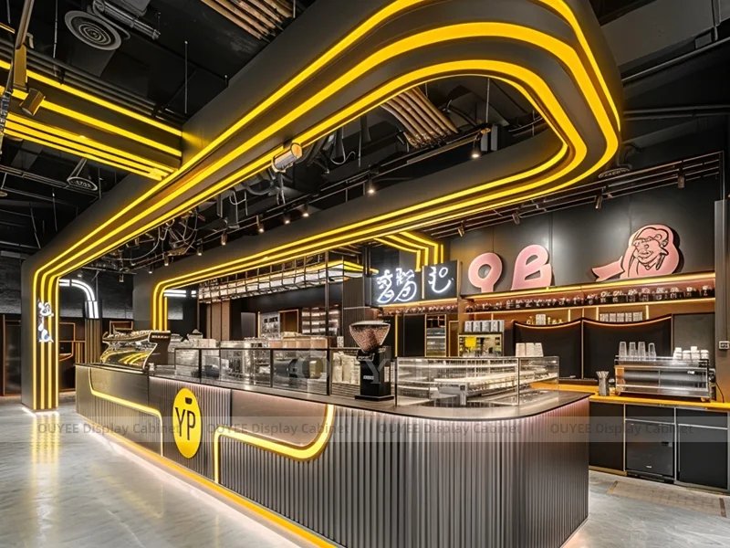 OUYEE supports coffee counter design, shop drawings, material selection, manufacturing, packing, and export delivery. We can customize the fixture according to your brand color, logo, store size, electrical planning, and installation requirements.