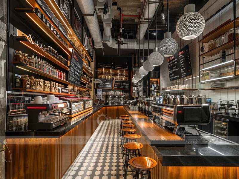 OUYEE supports coffee counter design, shop drawings, material selection, manufacturing, packing, and export delivery. We can customize the fixture according to your brand color, logo, store size, electrical planning, and installation requirements.
