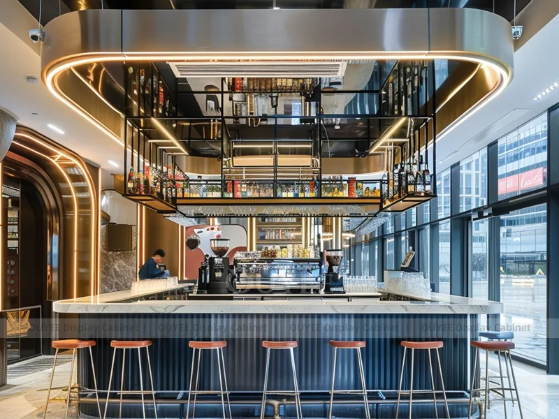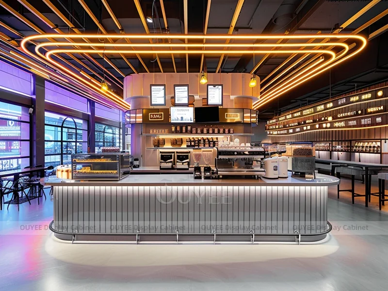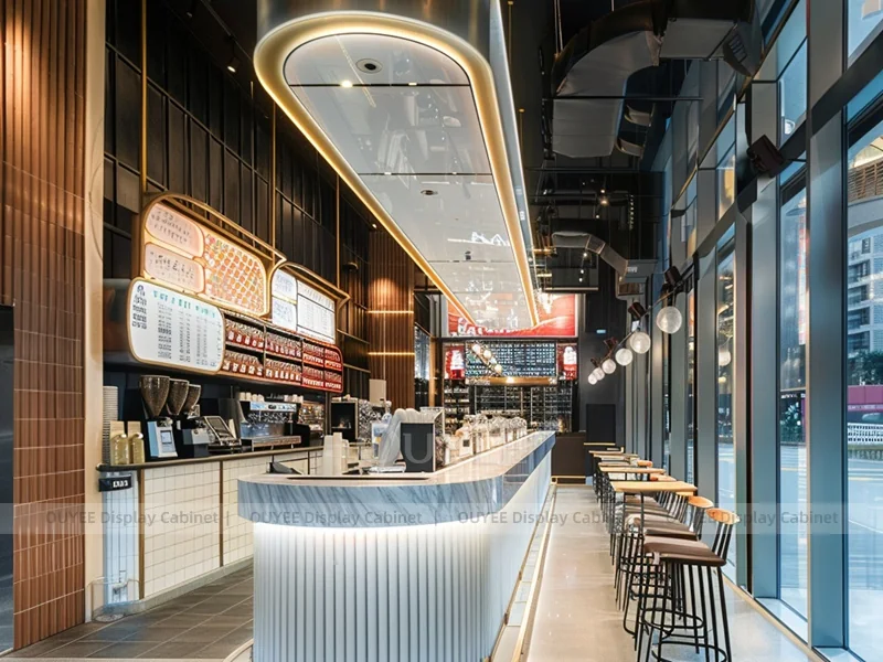 OUYEE supports coffee counter design, shop drawings, material selection, manufacturing, packing, and export delivery. We can customize the fixture according to your brand color, logo, store size, electrical planning, and installation requirements.