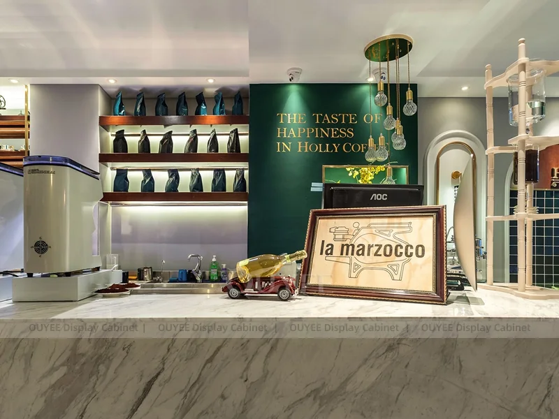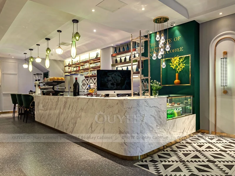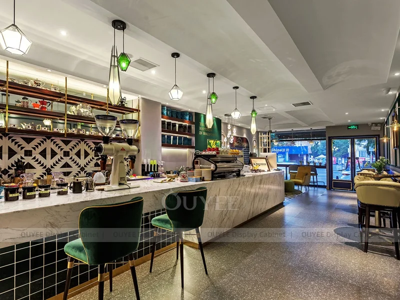 OUYEE supports coffee counter design, shop drawings, material selection, manufacturing, packing, and export delivery. We can customize the fixture according to your brand color, logo, store size, electrical planning, and installation requirements.