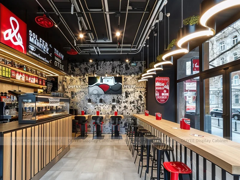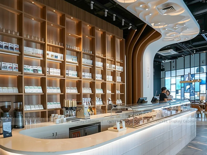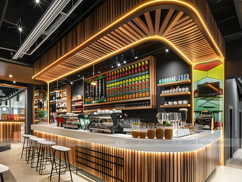 OUYEE supports coffee counter design, shop drawings, material selection, manufacturing, packing, and export delivery. We can customize the fixture according to your brand color, logo, store size, electrical planning, and installation requirements.