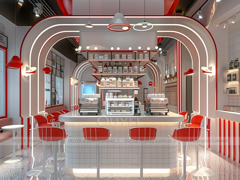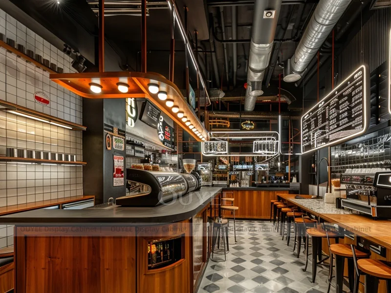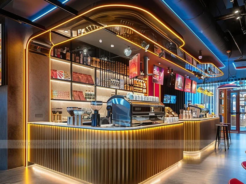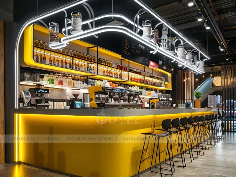 OUYEE supports coffee counter design, shop drawings, material selection, manufacturing, packing, and export delivery. We can customize the fixture according to your brand color, logo, store size, electrical planning, and installation requirements.