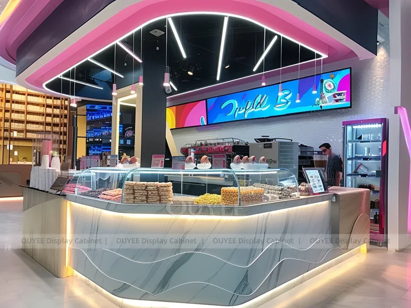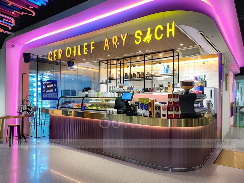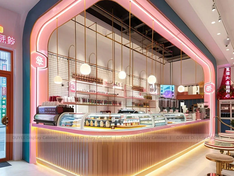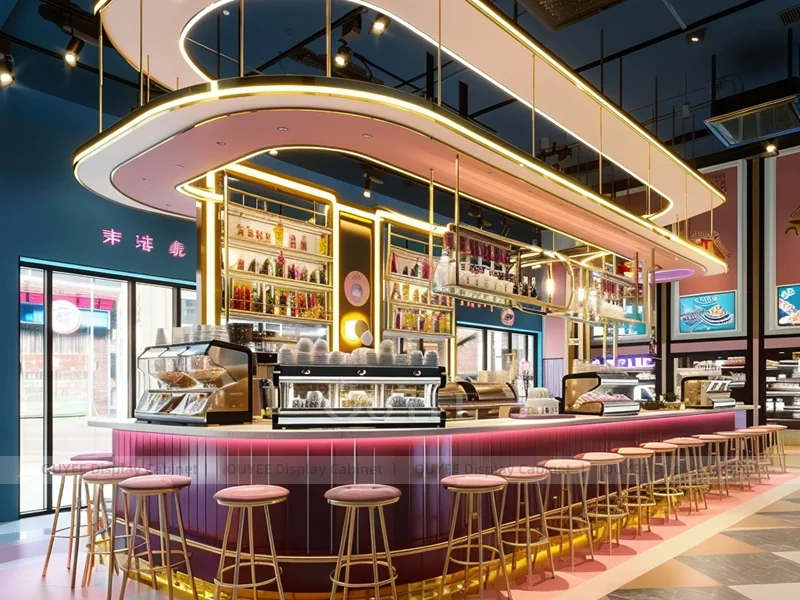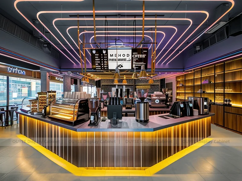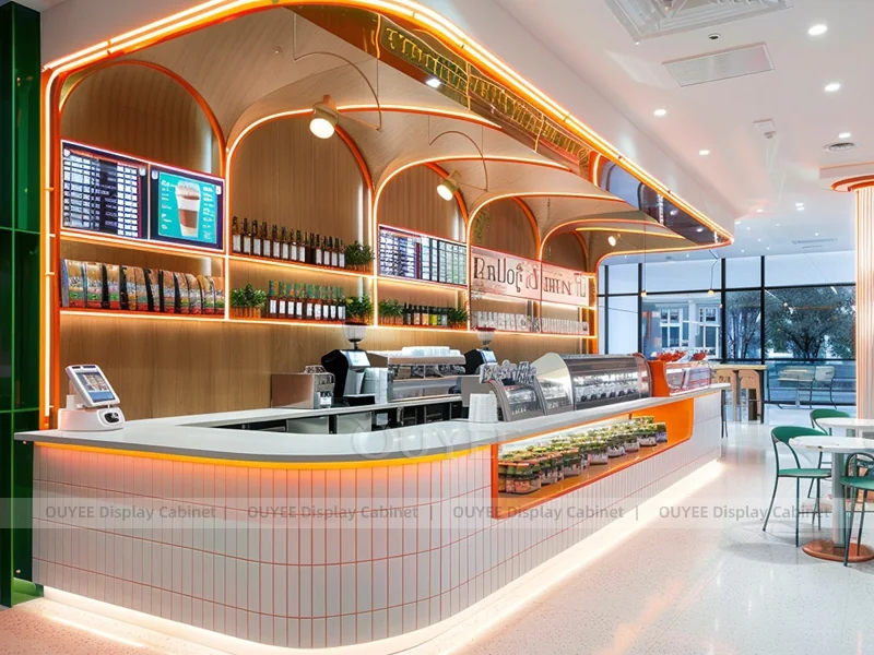 OUYEE supports coffee counter design, shop drawings, material selection, manufacturing, packing, and export delivery. We can customize the fixture according to your brand color, logo, store size, electrical planning, and installation requirements.