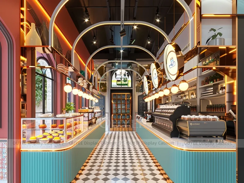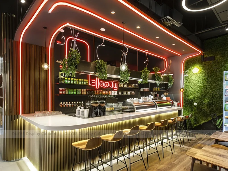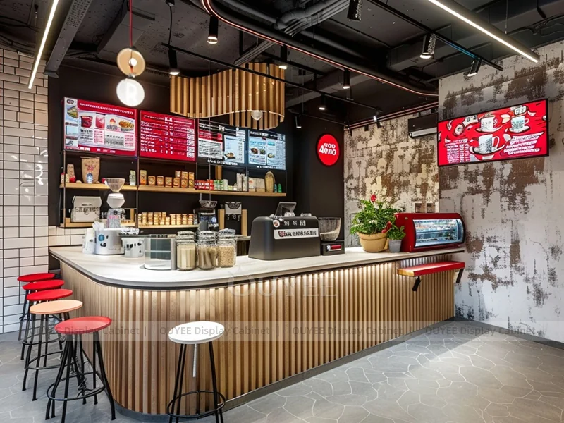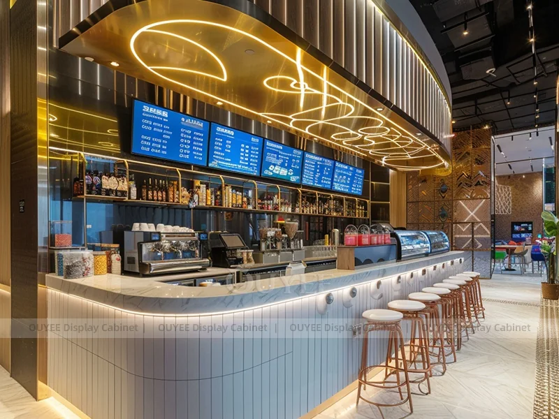 OUYEE supports coffee counter design, shop drawings, material selection, manufacturing, packing, and export delivery. We can customize the fixture according to your brand color, logo, store size, electrical planning, and installation requirements.