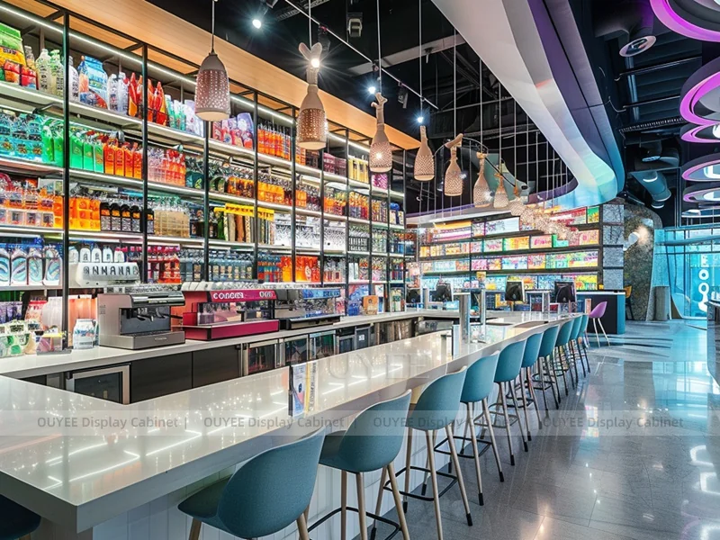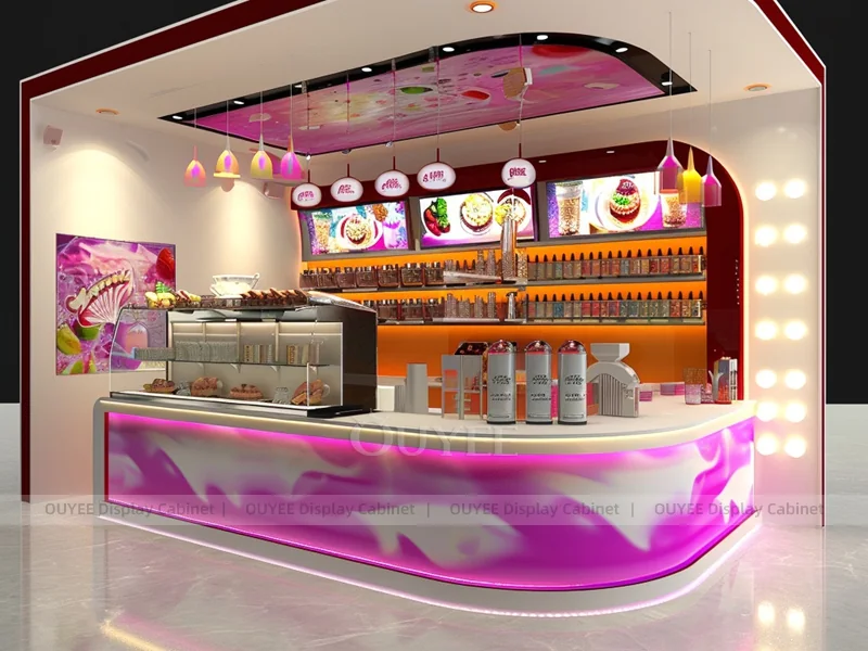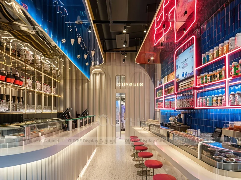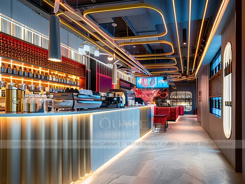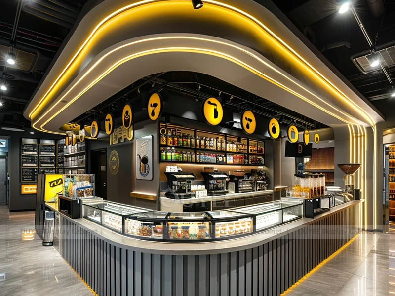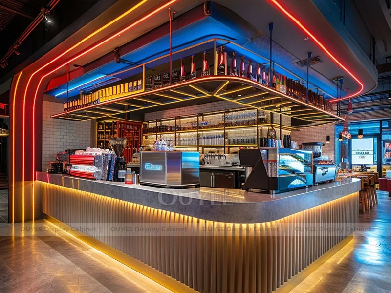 OUYEE supports coffee counter design, shop drawings, material selection, manufacturing, packing, and export delivery. We can customize the fixture according to your brand color, logo, store size, electrical planning, and installation requirements.