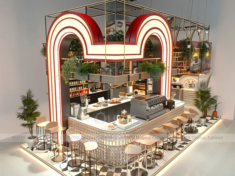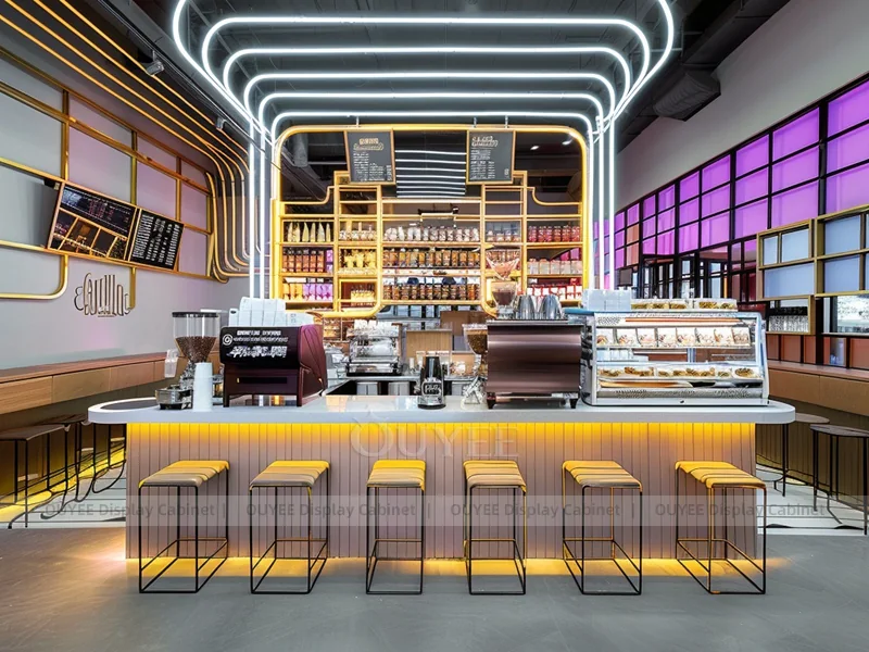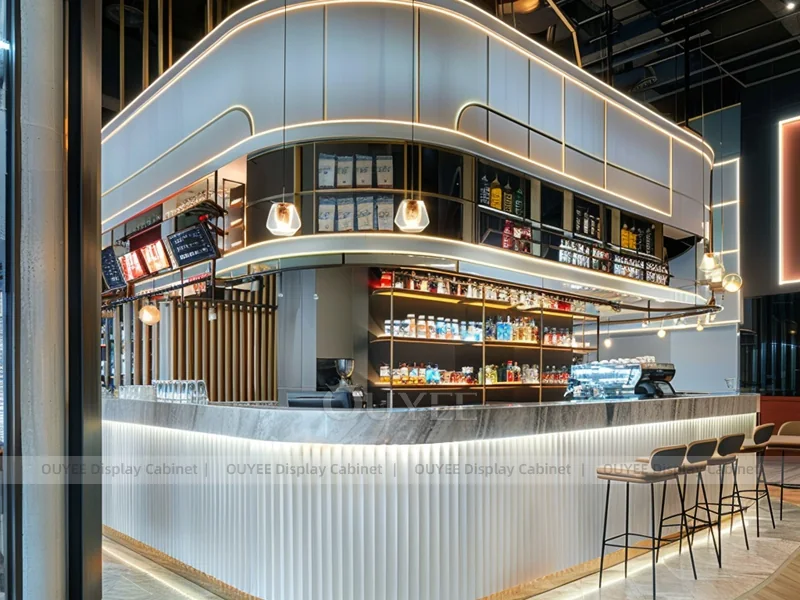 OUYEE supports coffee counter design, shop drawings, material selection, manufacturing, packing, and export delivery. We can customize the fixture according to your brand color, logo, store size, electrical planning, and installation requirements.