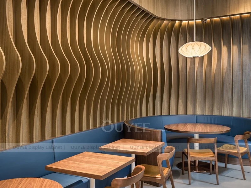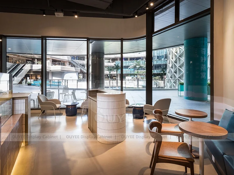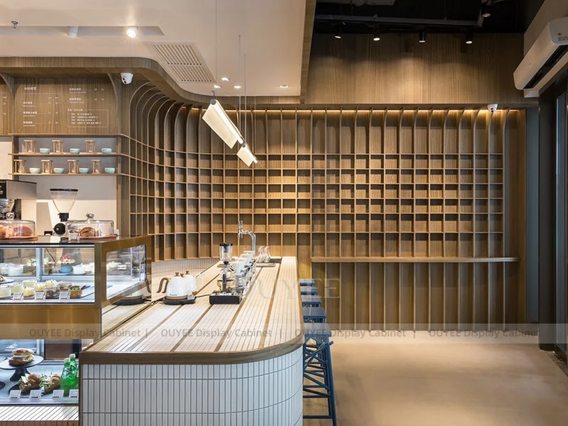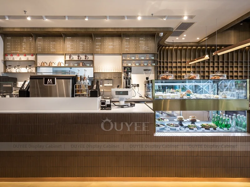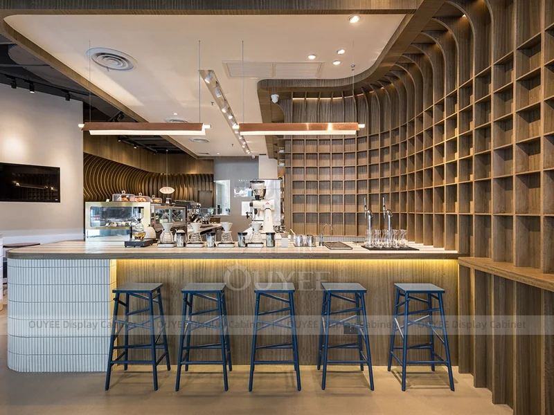 OUYEE supports coffee counter design, shop drawings, material selection, manufacturing, packing, and export delivery. We can customize the fixture according to your brand color, logo, store size, electrical planning, and installation requirements.