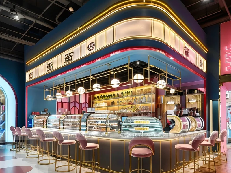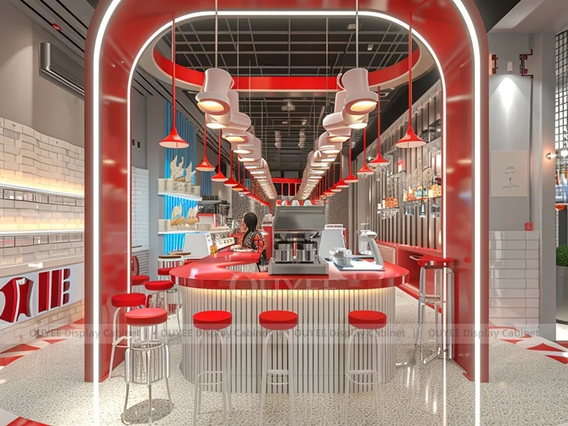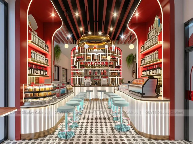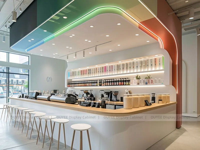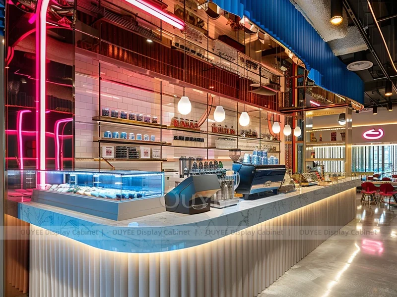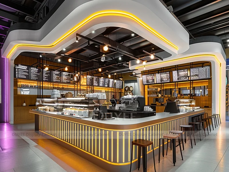 OUYEE supports coffee counter design, shop drawings, material selection, manufacturing, packing, and export delivery. We can customize the fixture according to your brand color, logo, store size, electrical planning, and installation requirements.