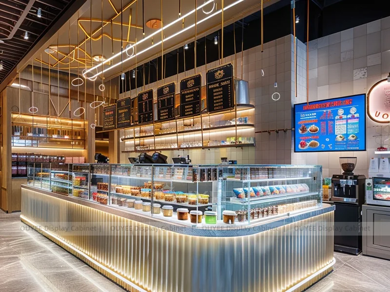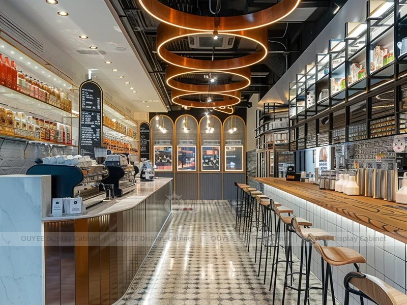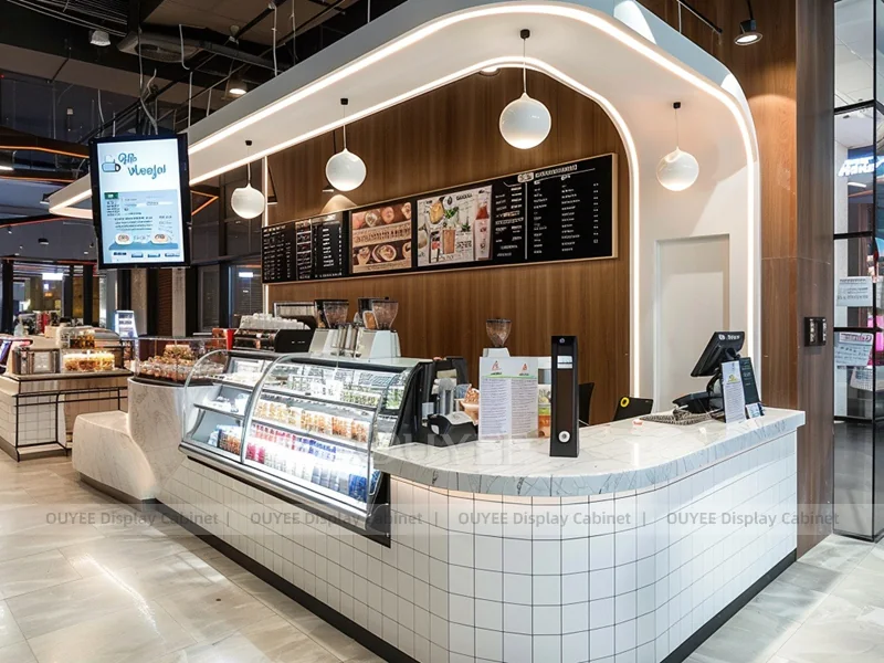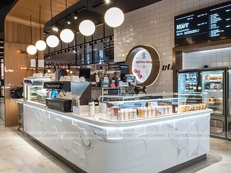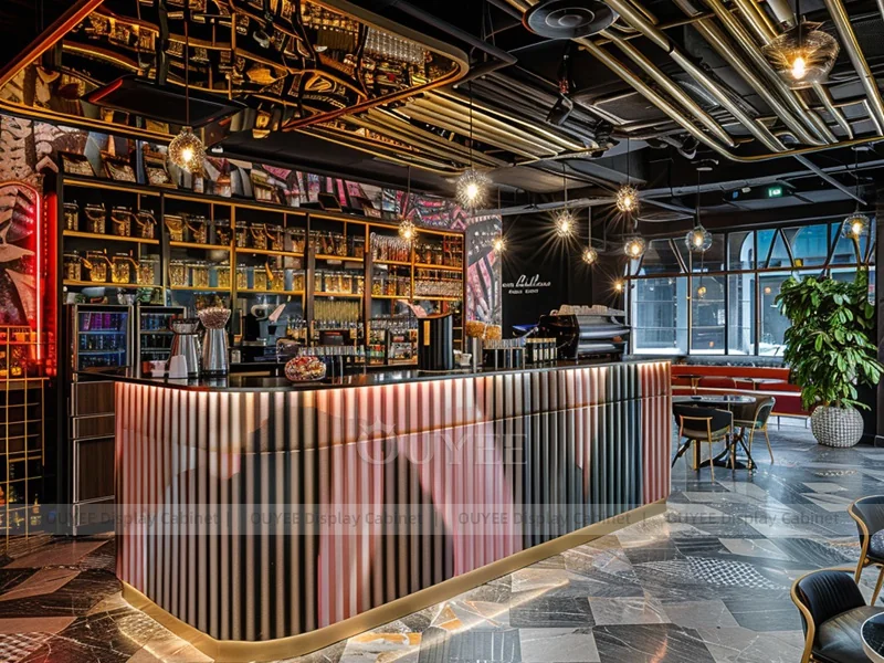 OUYEE supports coffee counter design, shop drawings, material selection, manufacturing, packing, and export delivery. We can customize the fixture according to your brand color, logo, store size, electrical planning, and installation requirements.