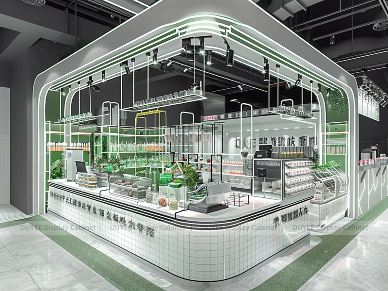 This coffee counter can be adjusted for front service, pickup, packaging, retail display, and back counter storage. It is suitable for new cafe builds, beverage shop renovations, and commercial kiosk projects that need a clear branded counter area.