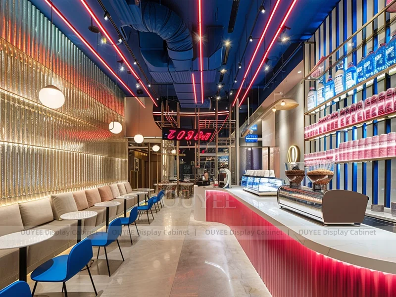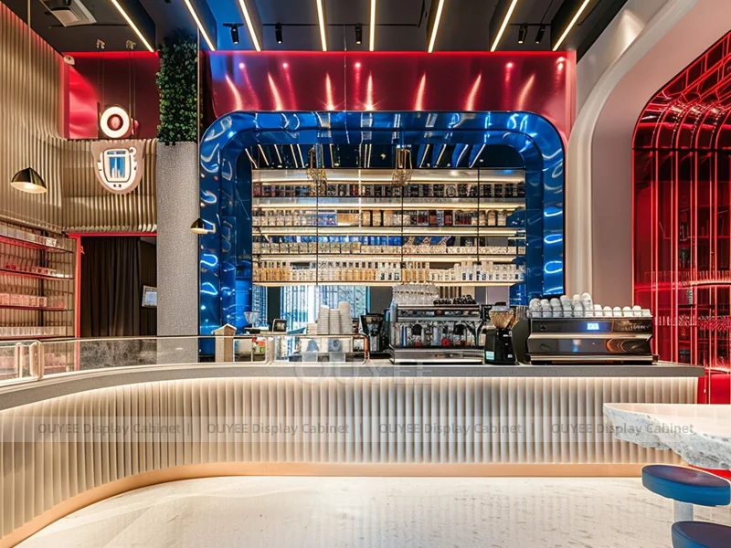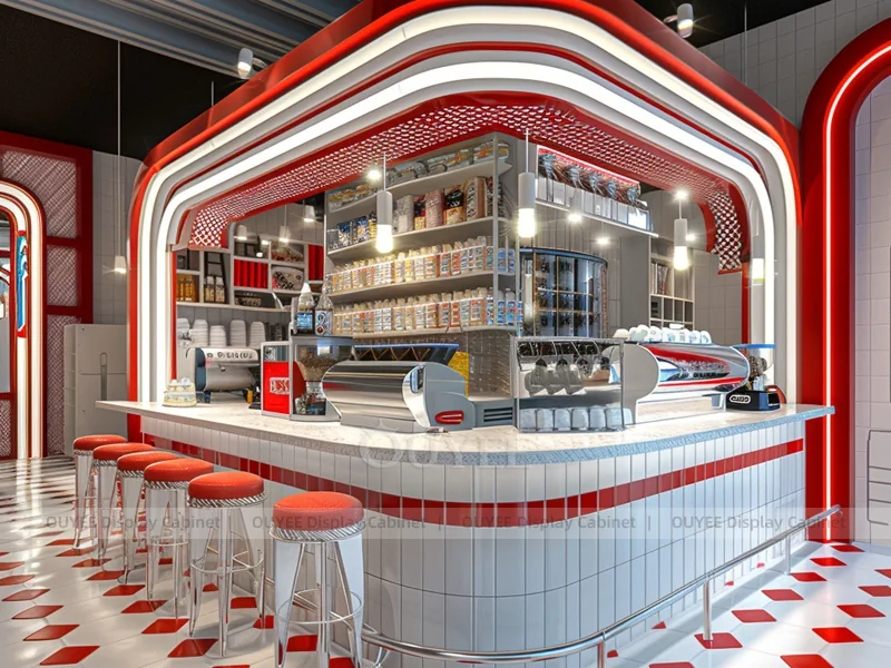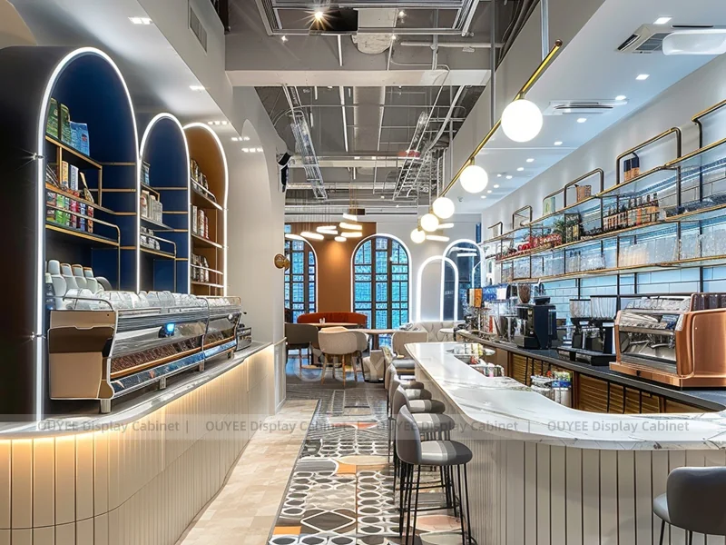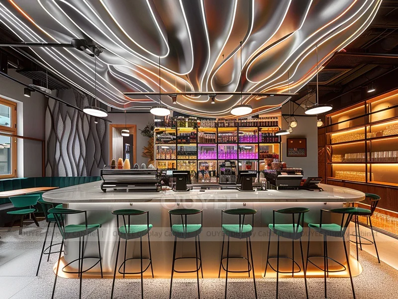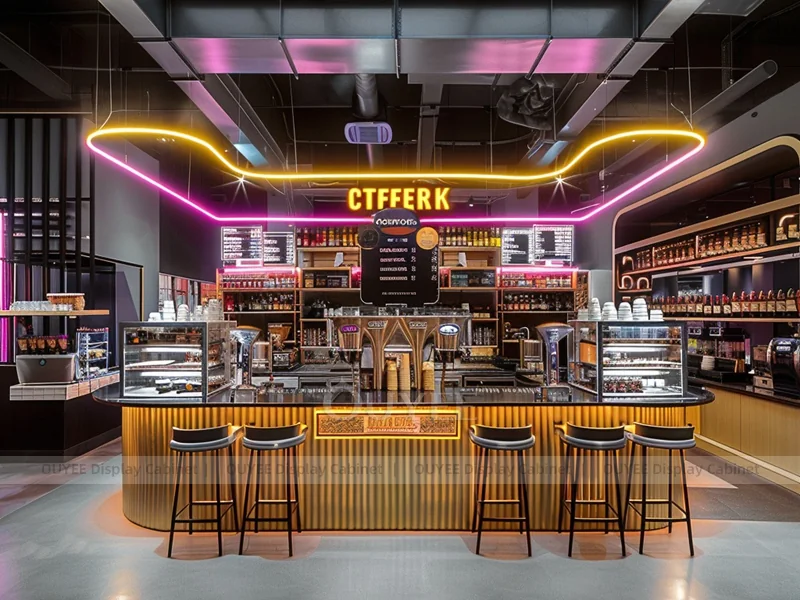 OUYEE supports coffee counter design, shop drawings, material selection, manufacturing, packing, and export delivery. We can customize the fixture according to your brand color, logo, store size, electrical planning, and installation requirements.