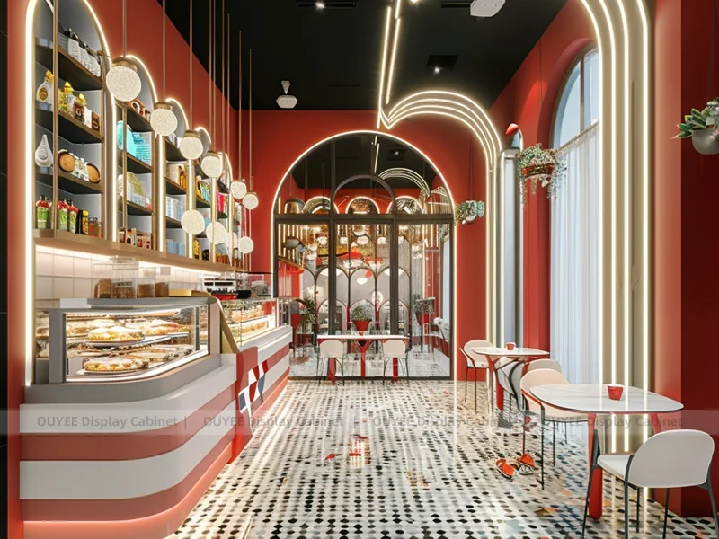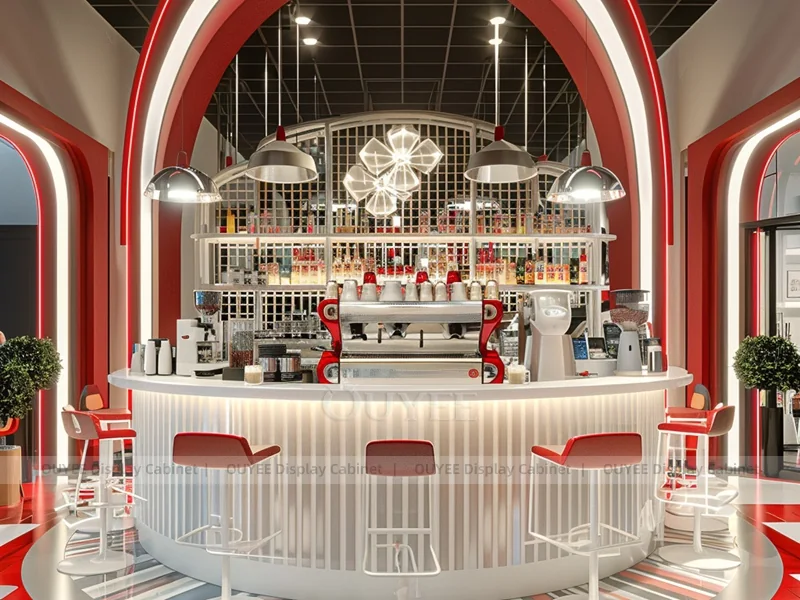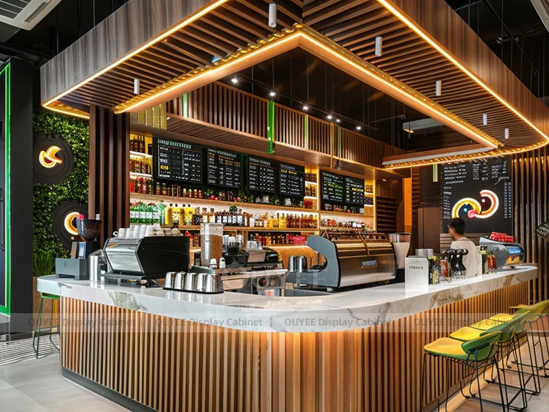 OUYEE supports coffee counter design, shop drawings, material selection, manufacturing, packing, and export delivery. We can customize the fixture according to your brand color, logo, store size, electrical planning, and installation requirements.