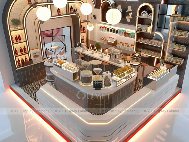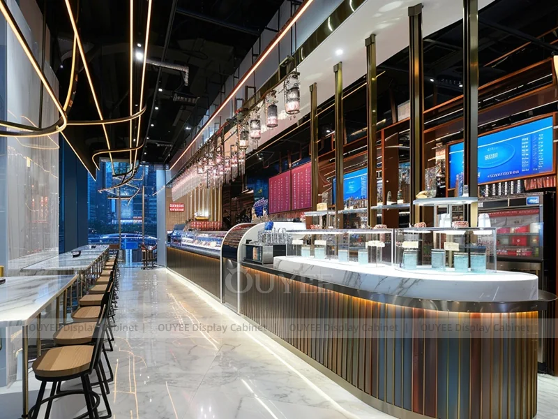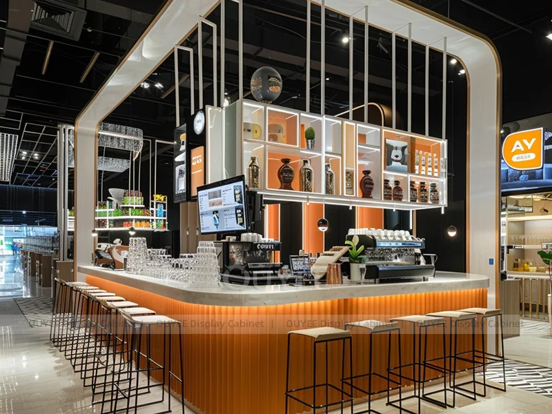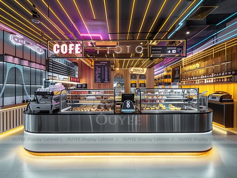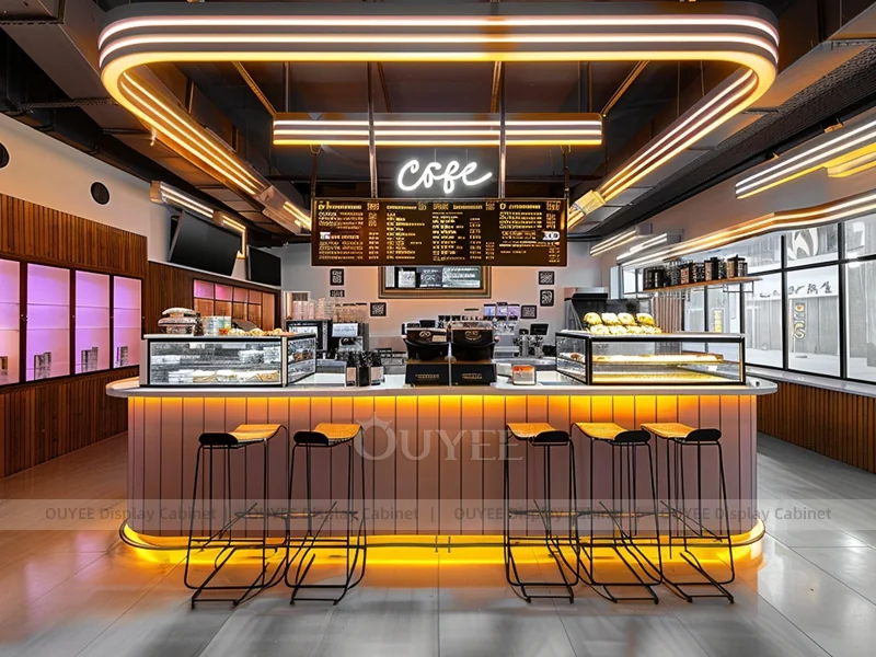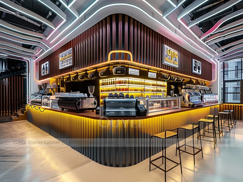OUYEE supports coffee counter design, shop drawings, material selection, manufacturing, packing, and export delivery. We can customize the fixture according to your brand color, logo, store size, electrical planning, and installation requirements.
