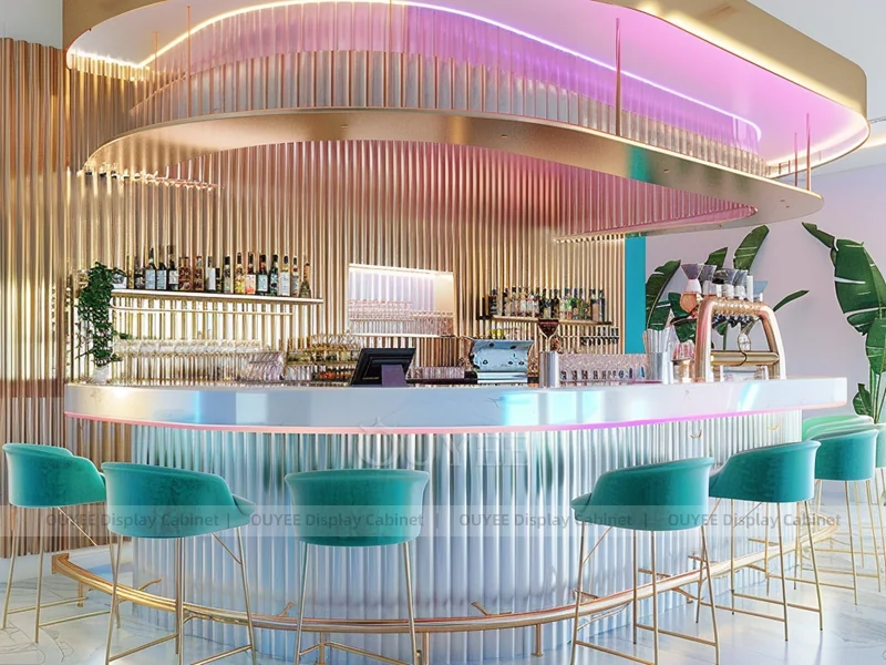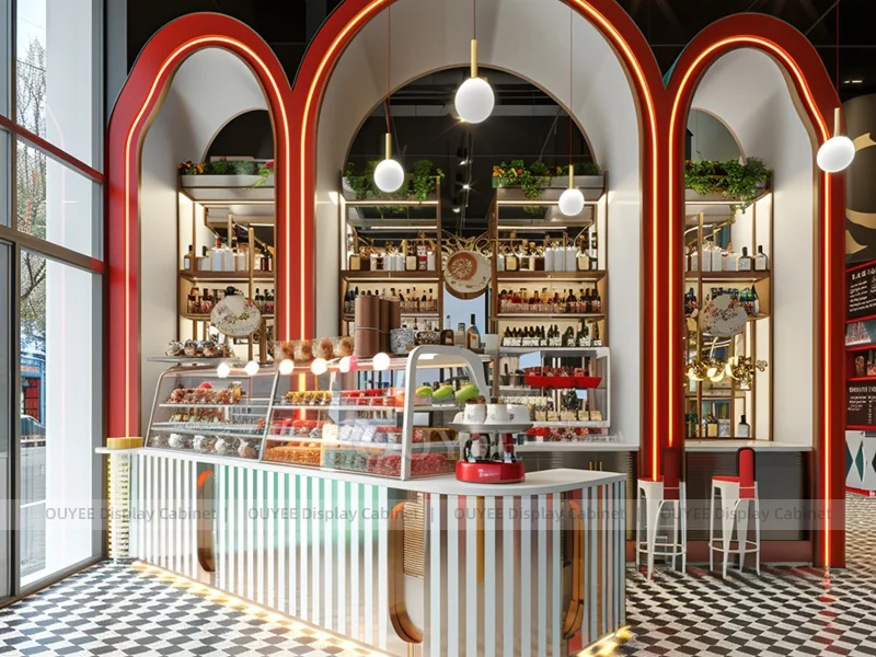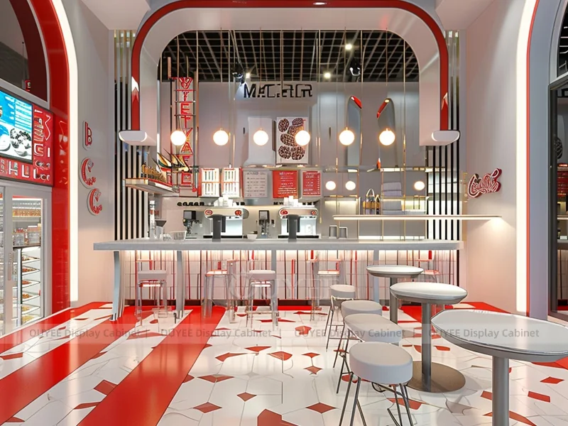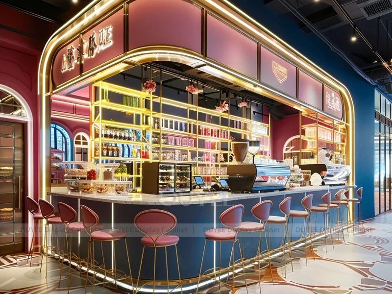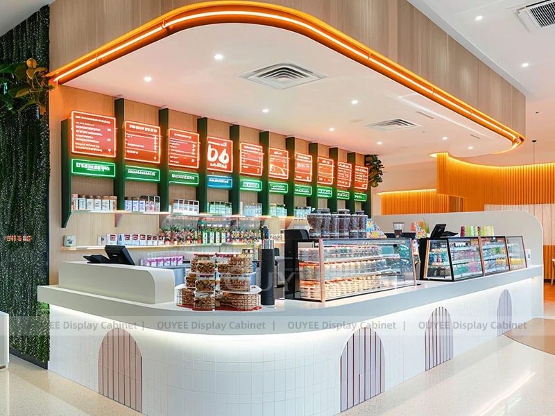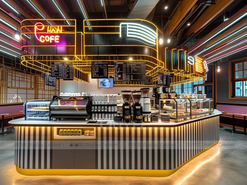 OUYEE supports coffee counter design, shop drawings, material selection, manufacturing, packing, and export delivery. We can customize the fixture according to your brand color, logo, store size, electrical planning, and installation requirements.
