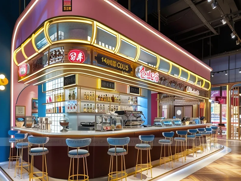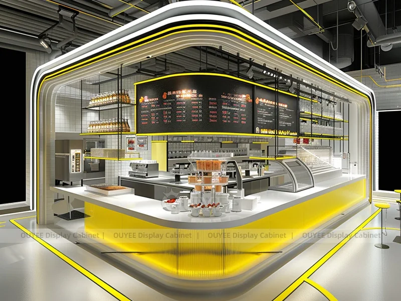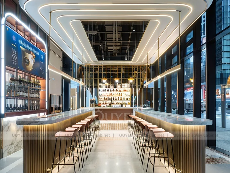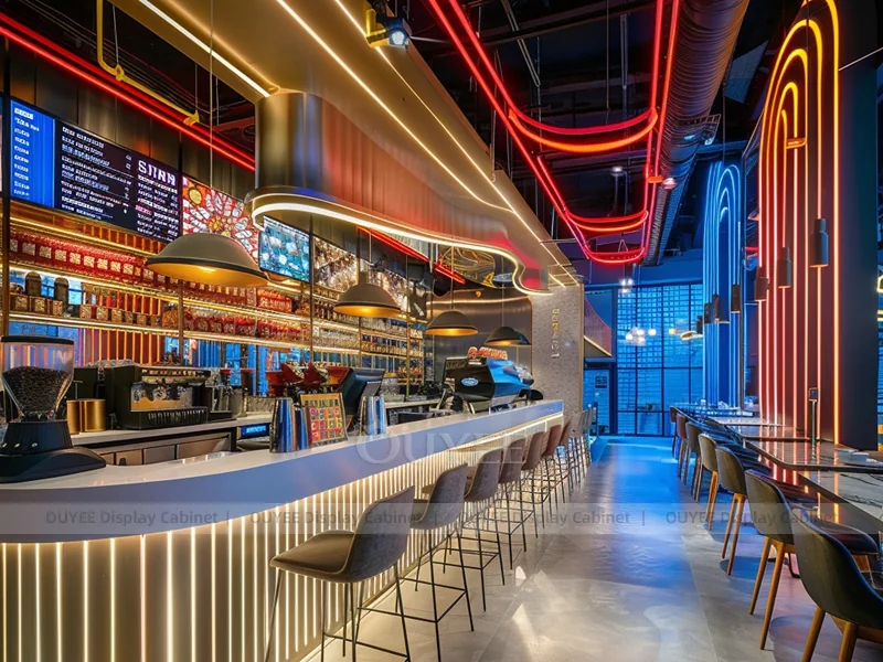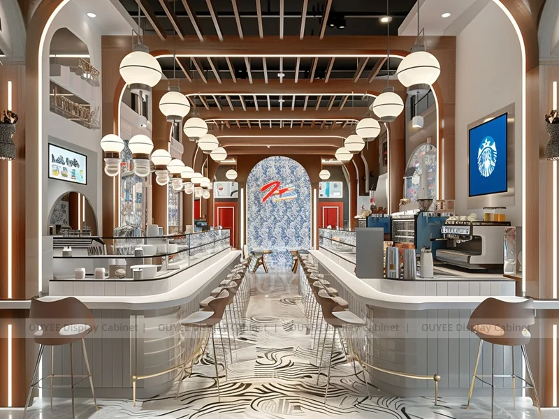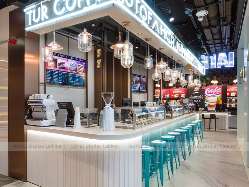 OUYEE supports coffee counter design, shop drawings, material selection, manufacturing, packing, and export delivery. We can customize the fixture according to your brand color, logo, store size, electrical planning, and installation requirements.
