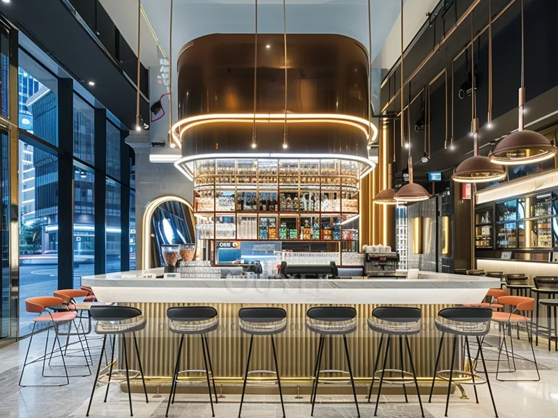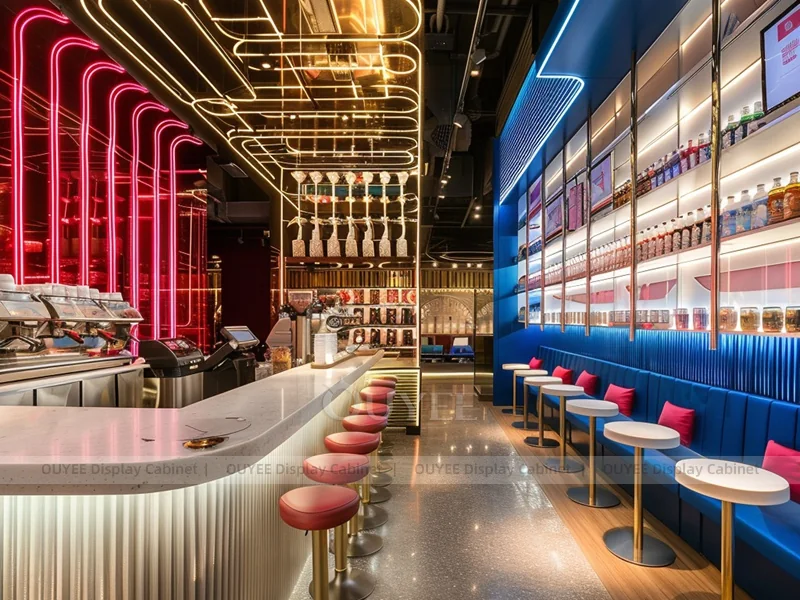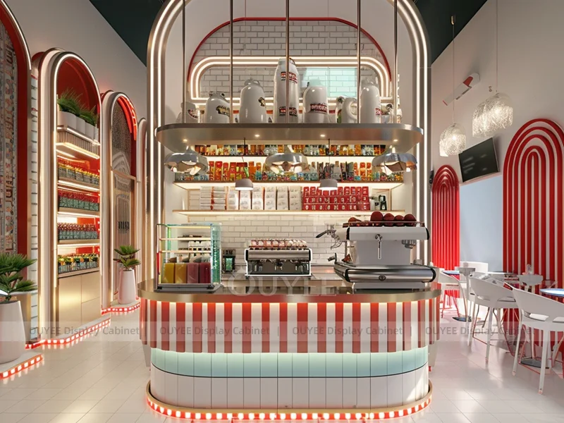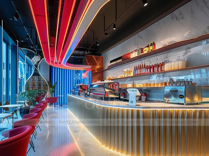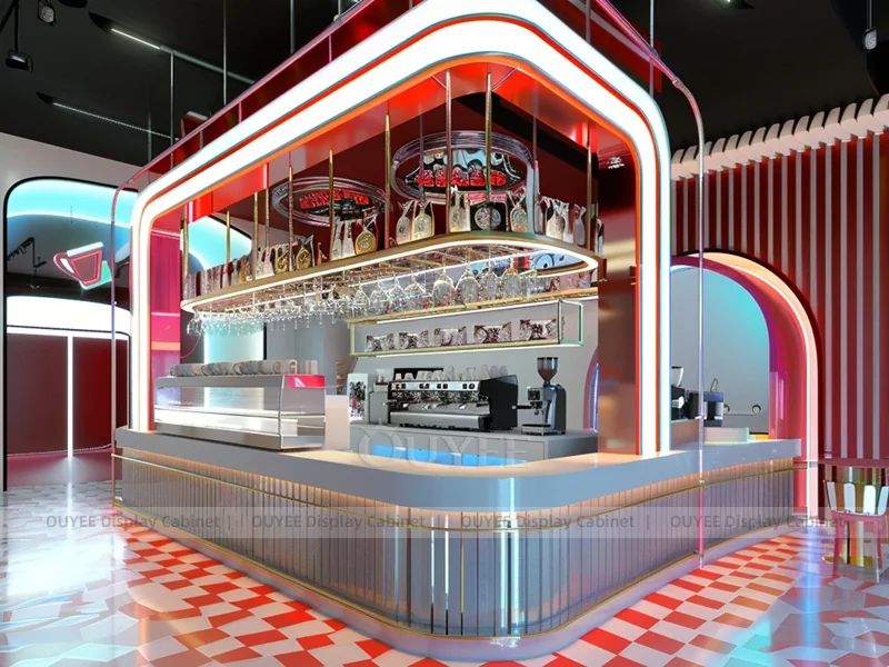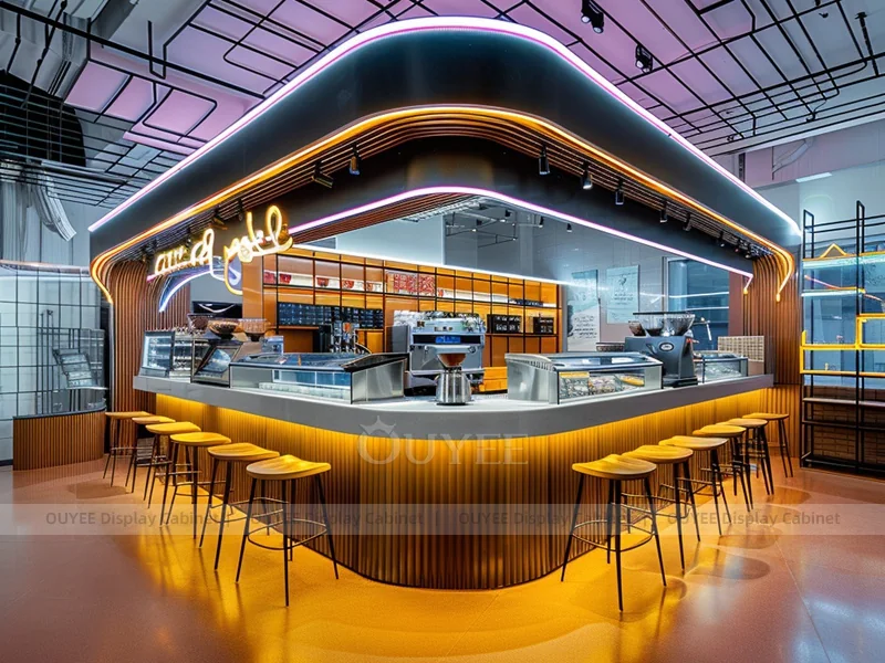 OUYEE supports coffee counter design, shop drawings, material selection, manufacturing, packing, and export delivery. We can customize the fixture according to your brand color, logo, store size, electrical planning, and installation requirements.