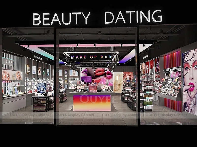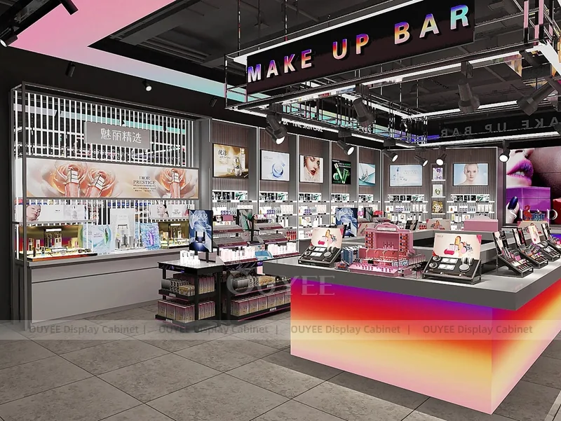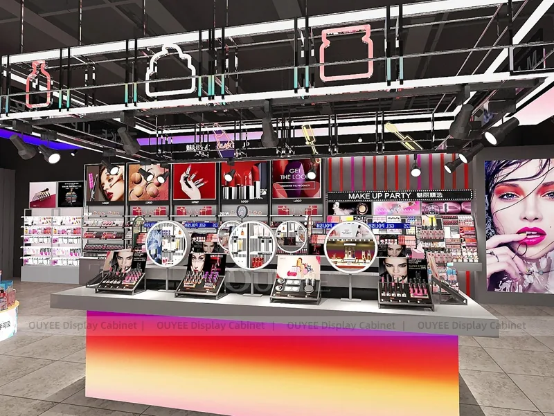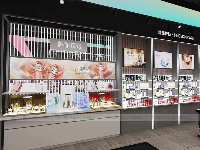 OUYEE can produce this model with commercial display panels, durable metal supports, tempered glass options, acrylic details, and integrated LED lighting. Dimensions, finish colors, shelf depths, light boxes, tester trays, logo panels, storage modules, and counter details can be adjusted to match the store plan and brand identity. Related inspiration is available across display shelves, wall display, display counter, and our store fixture manufacturing service.